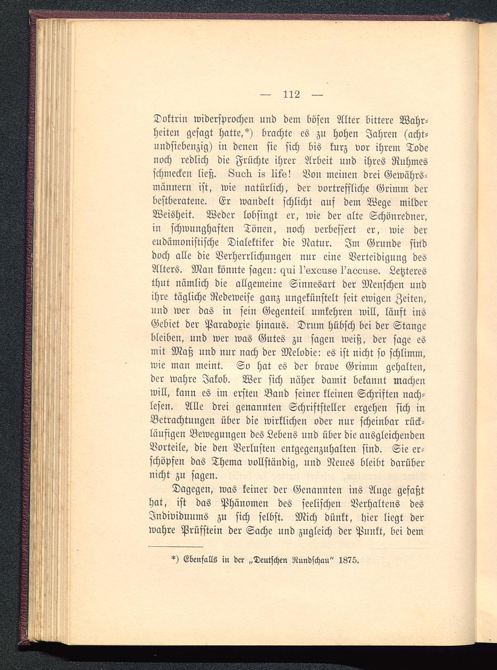 Doktrin widersprochen nnd dem bösen Alter bittere Wahr-heiten gesagt hatte,*) brachte es zu hohen Jahren (acht-undsiebenzig) in denen sie sich bis kurz vor ihrem Todenoch redlich die Früchte ihrer Arbeit und ihres Ruhmesschmecken ließ. Luvli is lits! Von meinen drei Gewährs-männern ist, wie natürlich, der vortreffliche Grimm derbestberatene. Er wandelt schlicht auf dem Wege milderWeisheit. Weder lobsiugt er, wie der alte Schönredner,in schwunghaften Tönen, noch verbessert er, wie dereudämonistische Dialektiker die Natur. Im Grunde sinddoch alle die Verherrlichungen nur eine Verteidigung desAlters. Man könnte sagen: cz^ui l'sxouss l'aoouss. Letzteresthut nämlich die allgemeine Sinnesart der Menschen undihre tägliche Redeweise ganz ungekünstelt seit ewigen Zeiten,und wer das in sein Gegenteil umkehren will, läuft insGebiet der Paradoxie hinaus. Drum hübsch bei der Stangebleiben, und wer was Gutes zu sagen weiß, der sage esniit Maß und nur nach der Melodie: es ist nicht so schlimm,wie man meint. So hat es der brave Grimm gehalten,der wahre Jakob. Wer sich näher damit bekannt machenwill, kann es im ersten Band seiner kleinen Schriften nach-lesen. Alle drei genannten Schriftsteller ergehen sich inBetrachtungen über die wirklichen oder nur scheinbar rück-läufigen Bewegungen des Lebens und über die ausgleichendenVorteile, die den Verlusten entgegenzuhalten sind. Sie er-schöpfen das Thema vollständig, und Neues bleibt darübernicht zu sagen.