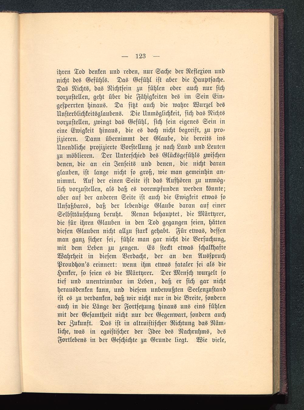 ihren Tod denken und reden, nur Sache der Reflexion undnicht des Gefühls. Das Gefühl ist aber die Hauptsache.Das Nichts, das Nichtsein zu fühlen oder auch nur sichvorzustellen, geht über die Fähigkeiten des im Sein Ein-gesperrten hinaus. Da sitzt auch die wahre Wurzel desUnsterblichkeitsglaubens. Die Unmöglichkeit, sich das Nichtsvorzustellen, zwingt das Gefühl, sich sein eigenes Sein ineine Ewigkeit hinaus, die es doch nicht begreift, zu pro-jizieren. Dann übernimmt der Glaube, die bereits insUnendliche projizierte Vorstellung je nach Land und Leutenzu möblieren. Der Unterschied des Glücksgefühls zwischendenen, die an ein Jenseits und denen, die nicht daranglauben, ist lange nicht so groß, wie man gemeinhin an-nimmt. Auf der einen Seite ist das Aufhören zu unmög-lich vorzustellen, als daß es vorempfunden werden könnte;aber auf der anderen Seite ist auch die Ewigkeit etwas soUnfaßbares, daß der lebendige Glaube daran auf einerSelbsttäuschung beruht. Renan behauptet, die Märtyrer,die für ihren Glauben in den Tod gegangen seien, hättendiesen Glauben nicht allzu stark gehabt. Für etwas, dessenman ganz sicher sei, fühle man gar nicht die Versuchung,mit dem Leben zu zeugen. Es steckt etwas schalkhafteWahrheit in diesem Verdacht, der an den AusspruchProudhon's erinnert: wenn ihm etwas fataler sei als dieHenker, so seien es die Märtyrer. Der Mensch wurzelt sotief und unentrinnbar im Leben, daß er sich gar nichtherausdenken kann, und diesem unbewußten Seelenzustandist es zu verdanken, daß wir nicht nur in die Breite, sondernauch in die Länge der Fortsetzung hinaus uns eins fühlenmit der Gesamtheit nicht nur der Gegenwart, sondern auchder Zukunft. Das ist in altruistischer Richtung das Näm-liche, was in egoistischer der Idee des Nachruhms, desFortlebens in der Geschichte zu Grunde liegt. Wie viele,