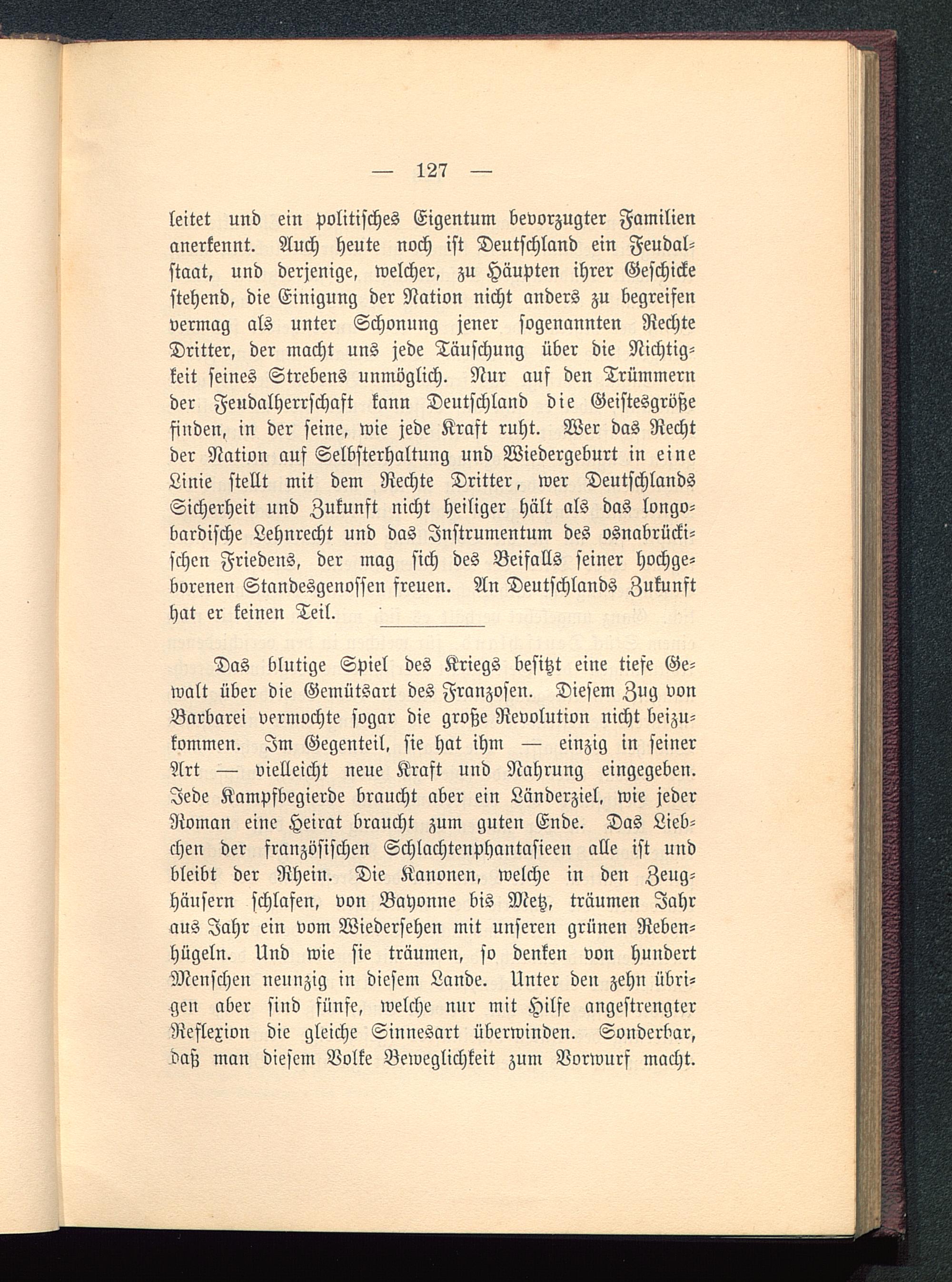 Das blutige Spiel des Kriegs besitzt eine tiefe Ge-walt über die Gemütsart des Franzosen . Diesem Zug vonBarbarei vermochte sogar die große Revolution nicht beizu-kommen. Im Gegenteil, sie hat ihm — einzig in seinerArt — vielleicht neue Kraft und Nahrung eingegeben.Jede Kampfbegierde braucht aber ein Länderziel, wie jederRoman eine Heirat braucht zum guten Ende. Das Lieb-chen der französischen Schlachtenphantasieen alle ist undbleibt der Rhein . Die Kanonen, welche in den Zeug-häusern schlafen, von Bayonne bis Metz, träumen Jahraus Jahr ein vom Wiedersehen mit unseren grünen Reben-hügeln. Und wie sie träumen, so denken von hundertMenschen neunzig in diesem Lande. Unter den zehn übri-gen aber sind fünfe, welche nur mit Hilfe angestrengterReflexion die gleiche Sinnesart überwinden. Sonderbar,daß man diesem Volke Beweglichkeit zum Vorwurf macht.