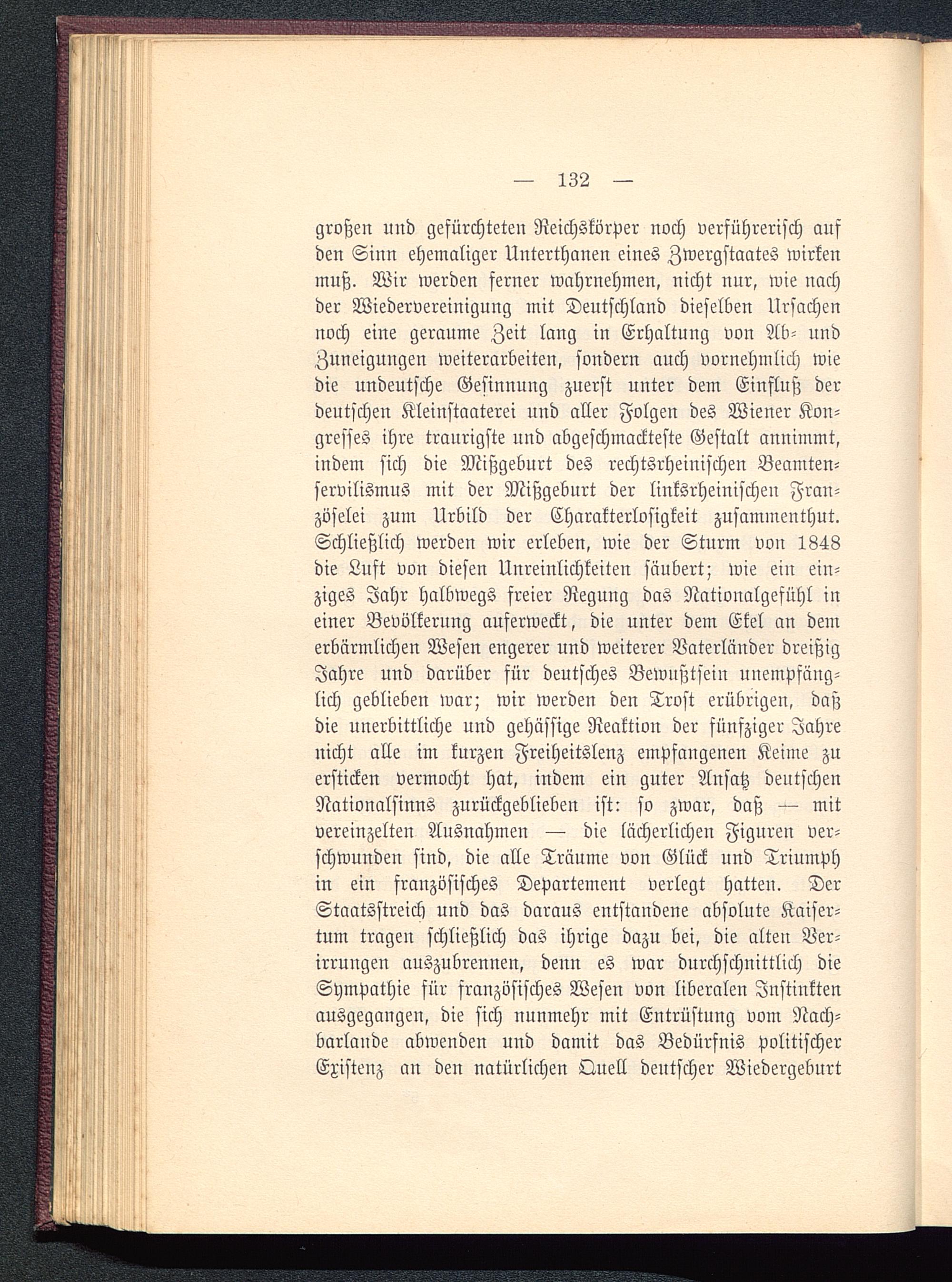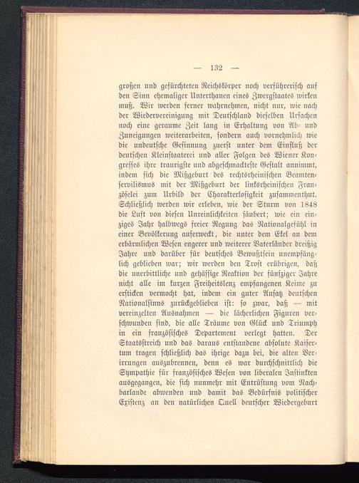 großen und gefurchtsten Reichskörper noch verführerisch anfden Sinn ehemaliger Unterthanen eines Zwergstaates wirkenmuß. Wir werden ferner wahrnehmen, nicht nur, wie nachder Wiedervereinigung mit Deutschland dieselben Ursachennoch eine geraume Zeit lang in Erhaltung von Ab- nndZuneigungen weiterarbeiten, sondern auch vornehmlich wiedie undeutsche Gesinnung zuerst unter dem Einfluß derdeutschen Kleinstaaterei und aller Folgen des Wiener Kon-gresses ihre traurigste und abgeschmackteste Gestalt annimmt,indem sich die Mißgeburt des rechtsrheinischen Beamten-servilismus mit der Mißgeburt der linksrheinischen Fran-zöselei zum Urbild der Charakterlosigkeit zusammenthut.Schließlich werden wir erleben, wie der Sturm von 1848die Luft von diesen Unreinlichkeiten säubert; wie ein ein-ziges Jahr halbwegs freier Regnng das Nationalgefühl ineiner Bevölkerung auferweckt, die unter dem Ekel an demerbärmlichen Wesen engerer und weiterer Vaterländer dreißigJahre und darüber für deutsches Bewußtsein uuempfäng-lich geblieben war; wir werden den Trost erübrigen, das;die unerbittliche und gehässige Reaktion der fünfziger Jahrenicht alle im kurzen Freiheitslenz empfangenen Keime zuersticken vermocht hat, indem ein guter Ansatz deutschenNationalsinns zurückgeblieben ist: so zwar, daß — mitvereinzelten Ausnahmen — die lächerlichen Figureil ver-schwunden sind, die alle Träume von Glück und Triumphin ein französisches Departement verlegt hatten. DerStaatsstreich und das daraus entstandene absolute Kaiser-tum tragen schließlich das ihrige dazu bei, die alten Ver-irrungen auszubrennen, denn es war durchschnittlich dieSympathie für französisches Wesen von liberalen Instinktenausgegangen, die sich nunmehr mit Entrüstung vom Nach-barlande abwenden und damit das Bedürfnis politischerExistenz an den natürlichen Quell deutscher Wiedergeburt
