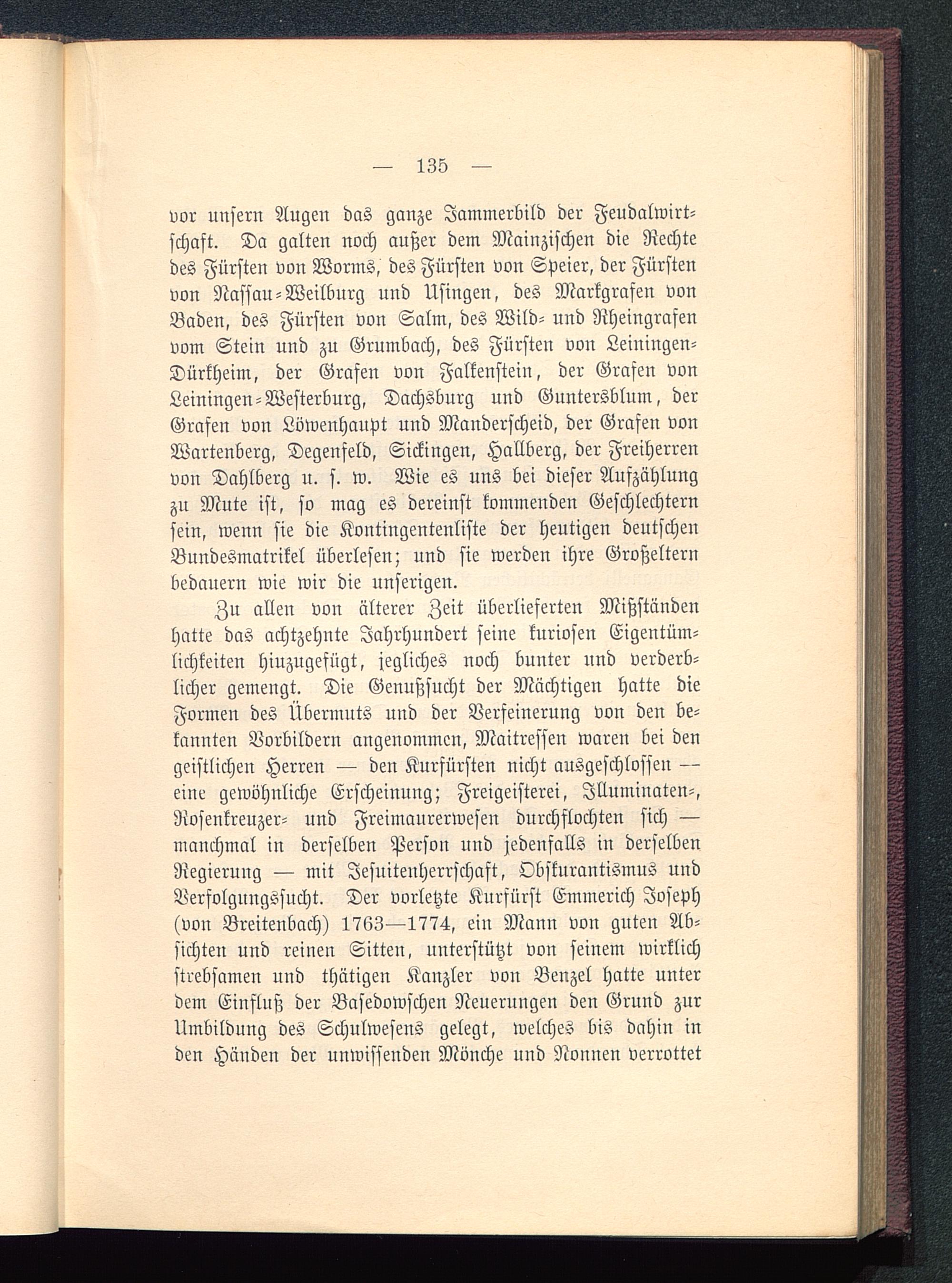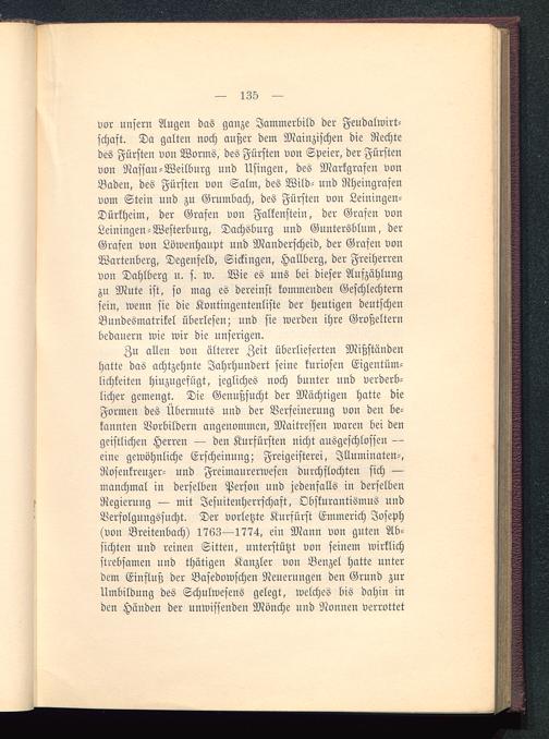 Zu allen von älterer Zeit überlieferten Mißständenhatte das achtzehnte Jahrhundert seine kuriosen Eigentüm-lichkeiten hinzugefügt, jegliches noch bunter nnd verderb-licher gemengt. Die Genußsucht der Mächtigen hatte dieFormen des Übermuts und der Verfeinerung von den be-kannten Vorbildern angenommen, Maitresfen waren bei dengeistlichen Herren — den Kurfürsten nicht ausgeschlosfen —eine gewöhnliche Erscheinung; Freigeisterei, Jlluminaten-,Rosenkreuzer - und Freimaurerwesen durchflochten sich —manchmal in derselben Person und jedenfalls in derselbenRegierung — mit Jesuiteuherrschaft, Obskurantismus undVerfolgungssucht. Der vorletzte Kurfürst Emmerich Joseph (von Breitenbach) 1763—1774, ein Mann von guten Ab-sichten und reinen Sitten, unterstützt von seinem wirklichstrebsamen und thätigen Kanzler von Benzel hatte unterdem Einfluß der Basedowschen Neuerungen den Grund zurUmbildung des Schulwesens gelegt, welches bis dahin inden Händen der unwissenden Mönche und Nonnen verrottet