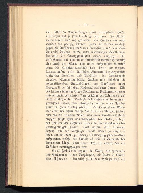 war. Aber die Nachwirkungen eines verwahrlosten VolkS-unterrichts sind so schnell nicht zu beseitigen. Die Massenwaren bigott und roh geblieben. Die Insassen von nichtweniger als zwanzig Klöstern hatten die Einwohnerschaftgegen die Aufklärungstendenzen fanatisiert, und beim TodeEmmerich Josephs wurde unter erbärmlichen Pöbeldemon-strationen die Strengglänbigkeit wieder eingesetzt. Umdiese Epoche und von ihr an fortwirkend machte sich nämlicheine durch den Klerus von unten aufgewühlte Reaktiongegen die Aufklärungsversuche Luft, denen das Empor-kommen unserer ersten klassischen Literatur, die Regsamkeitzahlreicher Gelehrten und Publizisten, die Gönnerschafteinzelner bildungsfreundlicher Fürsten und schließlich diemodernisierenden Anwandlungen des Papsttums unterGanganelli beträchtlichen Nachdruck verliehen hatten. Mitdes letzteren famosem Breve Dominvis Nsclsrrixtor riostsrund der darin dekretierten Unterdrückung der Jesuiten (1773)waren endlich auch in Deutschland die Pfaffenfeinde zu einempraktischen Erfolg, aber gleichzeitig auch zu einem Wende-punkt in ihrem Einfluß gediehen. Der Kurfürst von Mainz war einer der ersten, welche das Breve in Vollzug setzten;aber als die frommen Väter unter einer Kavallerie-Eskorteabzogen, folgte ihnen das Wehegeheul der Weiber, und zuden Fenstern des Schlosses stiegen die Verwünschungen derDummgläubigen hinauf. Bald darauf starb EmmerichJoseph , und der Nachfolger machte Miene (er mußte esschon, um seine Wahl zu sichern), als Werkzeug jener Reaktionaufzutreten, welche von damals ab, wie im Vorgefühl derkommenden Dinge, jeden neuen Regenten ergriff, dem einAufklärer vorausgegangen war.