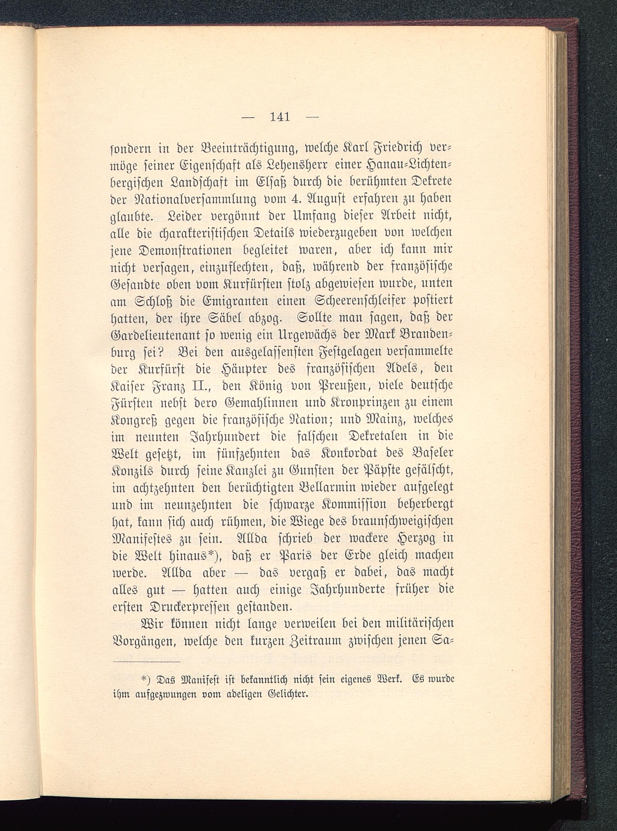 sondern in der Beeinträchtigung, welche Karl Friedrich ver-möge seiner Eigenschaft als Lehensherr einer Hanau -Lichten-bergischen Landschaft im Elsaß durch die berühmten Dekreteder Nationalversammlung vom 4. August erfahren zu habenglaubte. Leider vergönnt der Umfang dieser Arbeit nicht,alle die charakteristischen Details wiederzugeben von welchenjene Demonstrationen begleitet waren, aber ich kann mirnicht versagen, einzuflechten, daß, während der französischeGesandte oben vom Kurfürsten stolz abgewiesen wurde, untenam Schloß die Emigranten einen Scheereuschleifer postierthatten, der ihre Säbel abzog. Sollte man sagen, daß derGardelieutenant so wenig ein Urgewächs der Mark Branden-burg sei? Bei den ausgelassensten Festgelagen versammelteder Kurfürst die Häupter des französischen Adels, denKaiser Franz II. , den König von Preußen, viele deutscheFürsten nebst dero Gemahlinnen und Kronprinzen zu einemKongreß gegen die französische Nation; und Mainz , welchesim neunten Jahrhundert die falschen Dekretalen in dieWelt gesetzt, im fünfzehnten das Konkordat des BaselerKonzils durch seine Kanzlei zu Gunsten der Päpste gefälscht,im achtzehnten den berüchtigten Bellarmin wieder aufgelegtund im neunzehnten die schwarze Kommission beherbergthat, kaun sich auch rühmen, die Wiege des braunschweigischenManifestes zu sein. Allda schrieb der wackere Herzog indie Welt hinaus^), daß er Paris der Erde gleich machenwerde. Allda aber — das vergaß er dabei, das machtalles gut — hatten auch einige Jahrhunderte srüher dieersten Druckerpresseu gestanden.