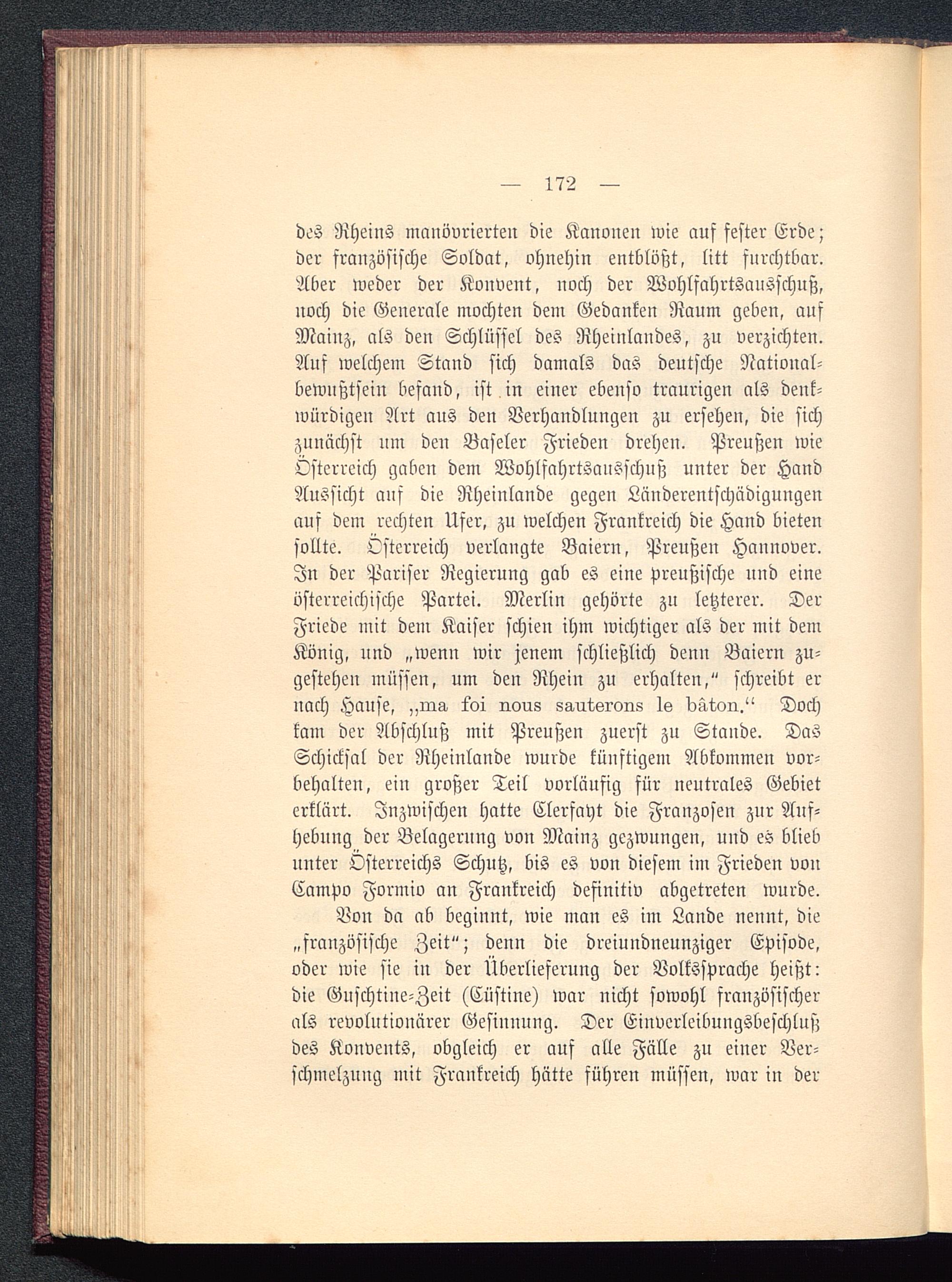 des Rheins manövrierten die Kanonen wie auf fester Erde;der französische Soldat, ohnehin entblößt, litt furchtbar.Aber weder der Konvent, noch der Wohlfahrtsausschuß,noch die Generale mochten dem Gedanken Raum geben, aufMainz , als den Schlüssel des Rheinlandes, zu verzichten.Auf welchem Stand sich damals das deutsche National-bewußtsein befand, ist in einer ebenso traurigen als denk-würdigen Art aus den Verhandlungen zu ersehen, die sichzunächst um den Baseler Frieden drehen. Preußen wieÖsterreich gaben dem Wohlfahrtsausschuß unter der HandAussicht auf die Rheinlande gegen Länderentschädigungenauf dem rechten Ufer, zu welchen Frankreich die Hand bietensollte. Osterreich verlangte Baiern, Preußen Hannover .In der Pariser Regierung gab es eine preußische uud eineösterreichische Partei. Merlin gehörte zu letzterer. DerFriede mit dem Kaiser schien ihm wichtiger als der mit demKönig, und „wenn wir jenem schließlich denn Baiern zu-gestehen müssen, um den Rhein zu erhalten," schreibt ernach Hause, „ins, loi novis saut-si-ons 1s datoir." Dochkam der Abschluß mit Preußen zuerst zu Stande. DasSchicksal der Rheinlande wurde künftigem Abkommen vor-behalten, ein großer Teil vorläufig für neutrales Gebieterklärt. Inzwischen hatte Clerfayt die Franzosen zur Auf-hebung der Belagerung von Mainz gezwungen, uud es bliebunter Österreichs Schutz, bis es von diesem im Frieden vonCampo Formio an Frankreich desinitiv abgetreten wurde.