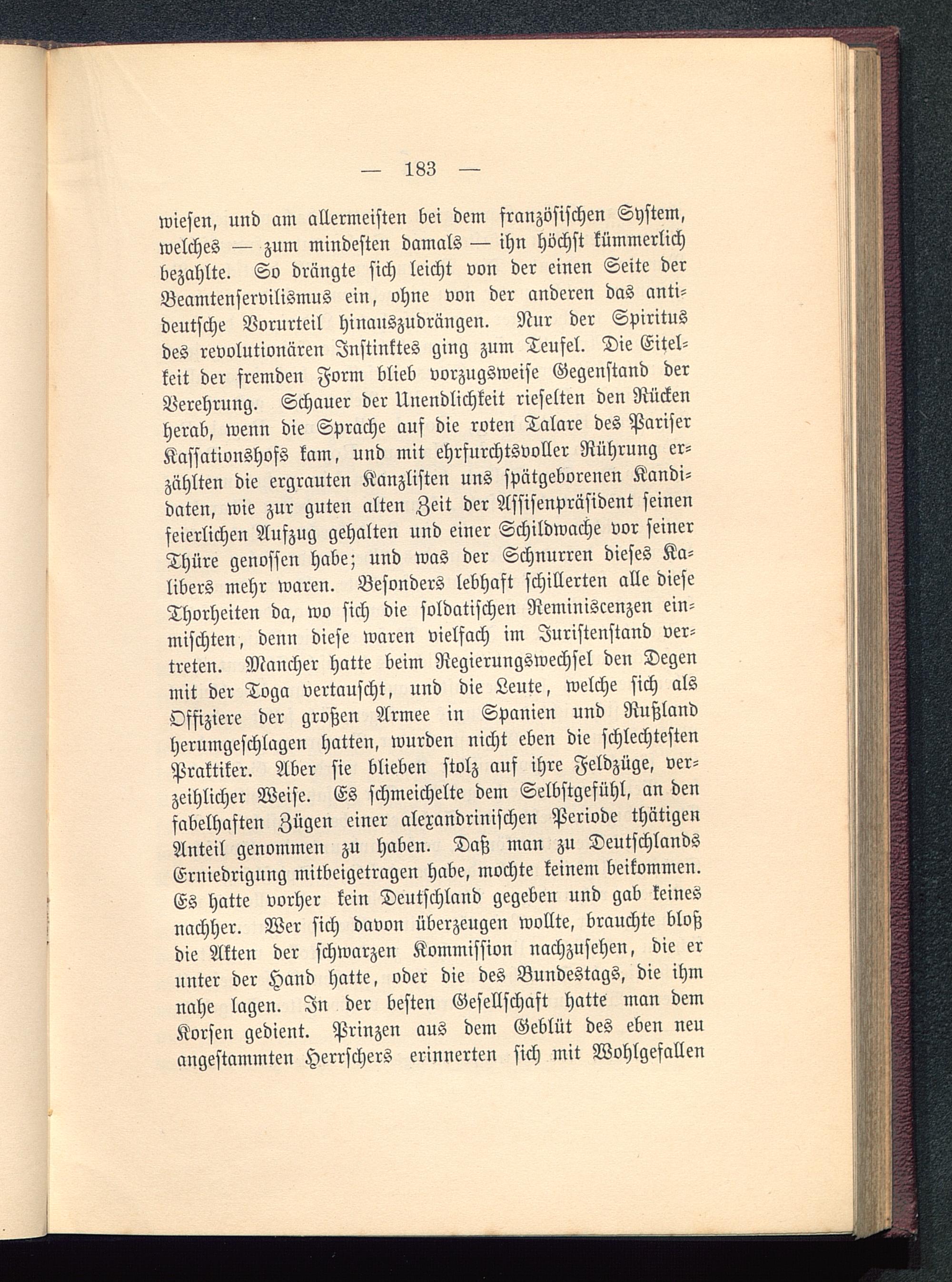 wiesen, und am allermeisten bei dem französischen System,welches — zum mindesten damals — ihn höchst kümmerlichbezahlte. So drängte sich leicht von der einen Seite derBeamtenservilismus ein, ohne von der anderen das anti-deutsche Vorurteil hinauszudrängen. Nur der Spiritusdes revolutionären Instinktes ging zum Teufel. Die Eitel-keit der fremden Form blieb vorzugsweise Gegenstand derVerehrung. Schauer der Unendlichkeit rieselten den Rückenherab, wenn die Sprache auf die roten Talare des PariserKassationshofs kam, und mit ehrfurchtsvoller Rührung er-zählten die ergrauten Kanzlisten uns spätgeborenen Kandi-daten, wie zur guten alten Zeit der Assisenpräsident seinenfeierlichen Aufzug gehalten und einer Schildwache vor seinerThüre genossen habe; und was der Schnurren dieses Ka-libers mehr waren. Besonders lebhaft schillerten alle dieseThorheiten da, wo sich die soldatischen Reminiscenzen ein-mischten, denn diese waren vielfach im Juristenstand ver-treten. Mancher hatte beim Regierungswechsel den Degenmit der Toga vertauscht, und die Leute, welche sich alsOffiziere der großen Armee in Spanien und Rußland herumgeschlagen hatten, wurden nicht eben die schlechtestenPraktiker. Aber sie blieben stolz auf ihre Feldzüge, ver-zeihlicher Weise. Es schmeichelte dem Selbstgefühl, an denfabelhaften Zügen einer alexandrinischen Periode thätigenAnteil genommen zu haben. Daß man zu Deutschlands Erniedrigung mitbeigetragen habe, mochte keinem beikommen.Es hatte vorher kein Deutschland gegeben und gab keinesnachher. Wer sich davon überzeugen wollte, brauchte bloßdie Akten der schwarzen Kommission nachzusehen, die erunter der Hand hatte, oder die des Bundestags, die ihmnahe lagen. In der besten Gesellschaft hatte man demKorsen gedient. Prinzen aus dem Geblüt des eben neuangestammten Herrschers erinnerten sich mit Wohlgefallen