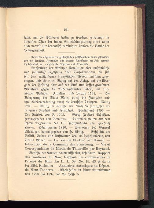 Darstellung der Mainzer Revolution oder umständlicheund freimütige Erzählung aller Vorfallenheiten, die sichseit dem entstandenen französischen Revolutionskrieg zuge-tragen, und die einen Bezug auf den Krieg, auf die Über-gabe der Festung oder auf den Klub und desfen grausamesVerfahren gegen die Andersgesinnten haben, mit allennötigen Beilagen. Frankfurt und Leipzig 1794. — DieBelagerung der Stadt Mainz durch die Franzosen undihre Wiedereroberung durch die deutschen Truppen. Mainz 1793. — Mainz im Genusse der durch die Franzosen er-rungenen Freiheit und Gleichheit. Deutschland 1793. —Der Patriot, vom I. 1793. — Georg Forsters Schriften,herausgegeben von Gervinus . —- Denkwürdigkeiten aus demletzten Dezennium des 18. Jahrhunderts von FriedrichHurter . Schaffhausen 1840. — Memoiren des GeneralEikemayer, herausgegeben von H. König. — Geschichte derPolitik, Kultur und Aufklärung des 18. Jahrhunderts, vonBruno Bauer . — I^g. Vis 6s Lt.-^ii8t xg-r Hg.ro.k1. —Revolution als 1s, (üorQiQuns clss Ltrgst>ori.rA. — Vis stL?orrssxoiuIg,iiOs <Is Nsrlin cls ?nionvi11s ^zg,r Rsvnand.— Berichte der Konvents-Kommissarien, besonders: liaMortckss Iroirtisrss du Ruin; Rg-xxort dss somrQisLgirss äs1'armss äu Rniir ^ II. I.. 39. «o. 15. 43 st 44 inder Lidl. Rionslisu — ^.rmug-irss statistic^uss clu. Dspart.6u Uont-Ioniisrrs. — Rheinhessen in seiner Entwickelungvon 1798 bis 1834 von W. Hesse ?c.