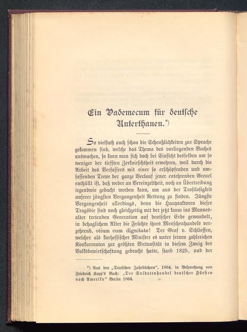 vielfach auch schon die Scheußlichkeiten zur Sprachegekommen sind, welche das Thema des vorliegenden Buchesausmachen, so kann man sich doch bei Einsicht desselben um soweniger der tiefsten Zerknirschtheit erwehren, weil durch dieArbeit des Verfassers mit einer so erschöpfenden und um-fassenden Treue der ganze Verlauf jener entehrenden Greuelenthüllt ist, daß weder an Vereinzeltheit, noch an Übertreibungirgendwie gedacht werden kann, um aus der Trostlosigkeitunserer jüngsten Vergangenheit Rettung zu finden. JüngsteVergangenheit allerdings, denn die Hauptaktoren dieserTragödie sind noch gleichzeitig mit der jetzt kaum ins Mannes-alter tretenden Generation auf deutscher Erde gewandelt,in behaglichem Alter die Früchte ihres Menschenhandels ver-zehrend, otiruri eurn diAru.tg.ts! Der Graf v. Schliessen,welcher als kurhessischer Minister es unter seinen zahlreichenKonkurrenten zur größten Virtuosität in diesem Zweig derVolksbewirtschaftung gebracht hatte, starb 1825, und der