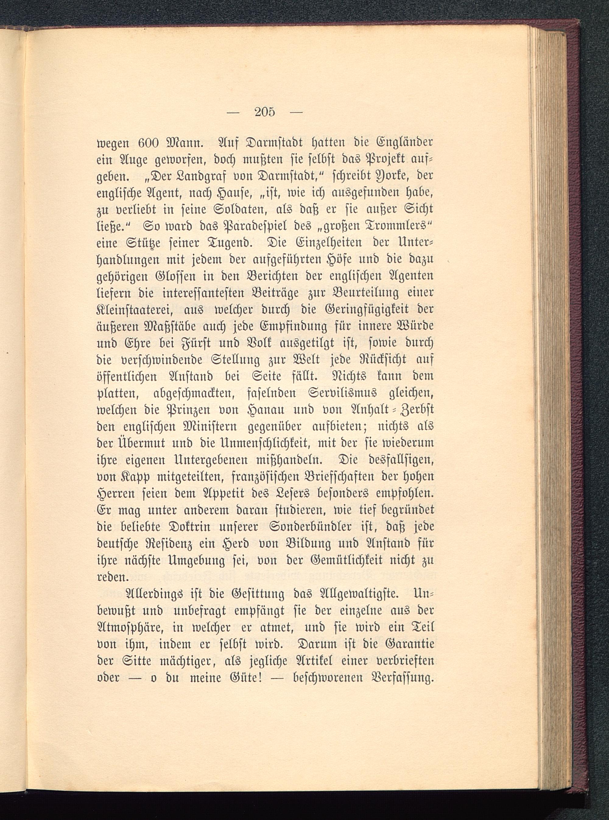 wegen 600 Mann. Auf Darmstadt hatten die Engländerein Auge geworfen, doch mußten sie selbst das Projekt auf-geben. „Der Landgraf von Darmstadt, " schreibt Jorke, derenglische Agent, nach Hause, „ist, wie ich ausgefunden habe,zu verliebt in seine Soldaten, als daß er sie außer Sichtließe." So ward das Paradespiel des „großen Trommlers"eine Stütze seiner Tugend. Die Einzelheiten der Unter-handlungen mit jedem der aufgeführten Höfe und die dazugehörigen Glossen in den Berichten der englischen Agentenliefern die interessantesten Beiträge zur Beurteilung einerKleinstaaterei, aus welcher durch die Geringfügigkeit deräußeren Maßstäbe auch jede Empfindung für innere Würdeund Ehre bei Fürst und Volk ausgetilgt ist, sowie durchdie verschwindende Stellung zur Welt jede Rücksicht auföffentlichen Anstand bei Seite fällt. Nichts kann demplatten, abgeschmackten, faselnden Servilismus gleichen,welchen die Prinzen von Hanau und von Anhalt - Zerbstden englischen Ministern gegenüber aufbieten; nichts alsder Übermut und die Unmenschlichkeit, mit der sie wiederumihre eigenen Untergebenen mißhandeln. Die desfallsigen,von Kapp mitgeteilten, französischen Briefschaften der hohenHerren seien dem Appetit des Lesers besonders empfohlen.Er mag unter anderem daran studieren, wie tief begründetdie beliebte Doktrin unserer Sonderbündler ist, daß jededeutsche Residenz ein Herd von Bildung und Anstand fürihre nächste Umgebung sei, vou der Gemütlichkeit nicht znreden.