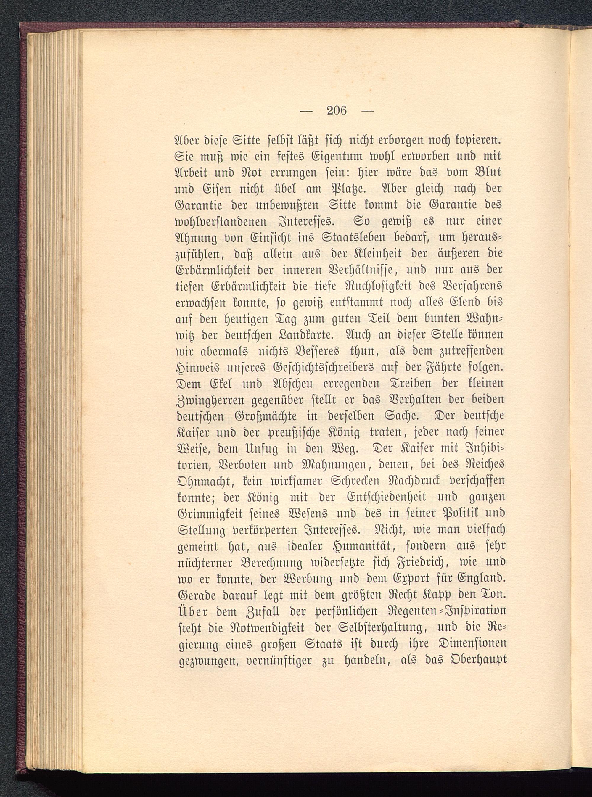 Aber diese Sitte selbst läßt sich nicht erborgen noch kopieren.Sie muß wie ein festes Eigentum wohl erworben und mitArbeit und Not errungen sein: hier wäre das vom Blutund Eisen nicht übel am Platze. Aber gleich nach derGarantie der unbewußten Sitte kommt die Garantie deswohlverstandenen Interesses. So gewiß es nur einerAhnung von Einsicht ins Staatsleben bedarf, um heraus-zufühlen, daß allein aus der Kleinheit der äußeren dieErbärmlichkeit der inneren Verhältnisse, und nur aus dertiefen Erbärmlichkeit die tiefe Ruchlosigkeit des Verfahrenserwachsen konnte, so gewiß entstammt noch alles Elend bisauf den heutigen Tag zum guten Teil dem bunten Wahn-witz der deutschen Landkarte. Auch an dieser Stelle könnenwir abermals uichts Besseres thun, als dem zutreffendenHinweis unseres Geschichtsschreibers auf der Fährte folgen.Dem Ekel und Abscheu erregenden Treiben der kleinenZwingherren gegenüber stellt er das Verhalten der beidendeutschen Großmächte in derselben Sache. Der deutscheKaiser und der Preußische König traten, jeder nach seinerWeise, dem Unfug in den Weg. Der Kaiser mit Jnhibi-torien, Verboten und Mahnungen, denen, bei des ReichesOhnmacht, kein wirksamer Schrecken Nachdruck verschaffenkonnte; der König mit der Entschiedenheit und ganzenGrimmigkeit seines Wesens und des in seiner Politik undStellung verkörperten Interesses. Nicht, wie man vielfachgemeint hat, aus idealer Humanität, sondern aus sehrnüchterner Berechnung widersetzte sich Friedrich, wie undwo er konnte, der Werbung und dem Export für England .Gerade darauf legt mit dem größten Recht Kapp den Ton.Über dem Zufall der persönlichen Regenten-Inspirationsteht die Notwendigkeit der Selbsterhaltung, und die Re-gierung eines großen Staats ist durch ihre Dimensionengezwungen, vernünftiger zu handeln, als das Oberhaupt