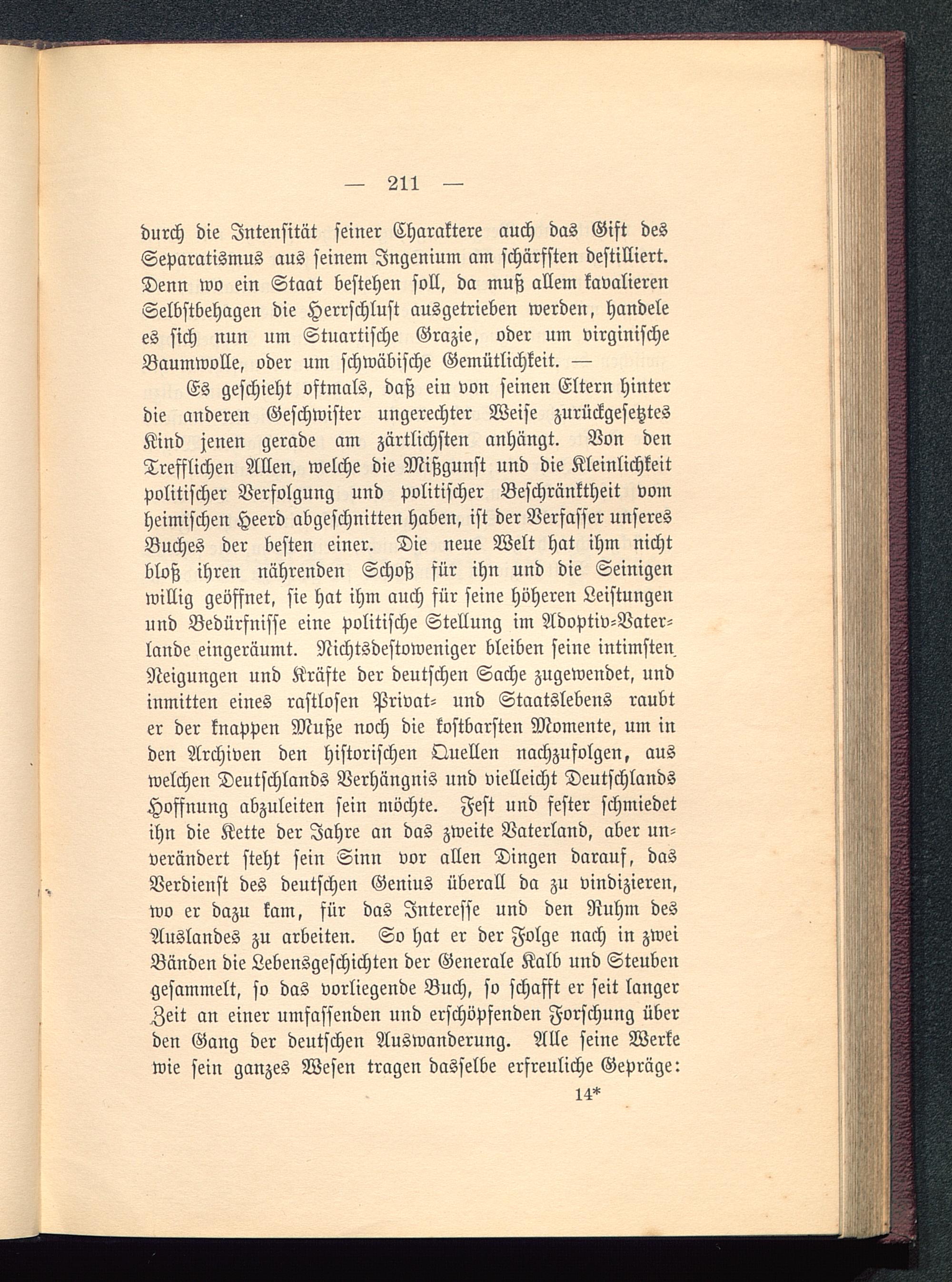 Es geschieht oftmals, daß ein von seinen Eltern hinterdie anderen Geschwister ungerechter Weise zurückgesetztesKind jenen gerade am zärtlichsten anhängt. Von denTrefflichen Allen, welche die Mißgunst und die Kleinlichkeitpolitischer Verfolgung und politischer Beschränktheit vomheimischen Heerd abgeschnitten haben, ist der Verfasser unseresBuches der besten einer. Die neue Welt hat ihm nichtbloß ihren nährenden Schoß für ihn und die Seinigenwillig geöffnet, sie hat ihm auch für seine höheren Leistungenund Bedürfnisse eine politische Stellung im Adoptiv -Vater-lande eingeräumt. Nichtsdestoweniger bleiben seine intimstenNeigungen und Kräfte der deutschen Sache zugewendet, undinmitten eines rastlosen Privat- und Staatslebens raubter der knappen Muße noch die kostbarsten Momente, um inden Archiven den historischen Quellen nachzufolgen, auswelchen Deutschlands Verhängnis und vielleicht Deutschlands Hoffnung abzuleiten sein möchte. Fest und fester schmiedetihn die Kette der Jahre an das zweite Vaterland, aber un-verändert steht sein Sinn vor allen Dingen darauf, dasVerdienst des deutschen Genius überall da zu vindizieren,wo er dazu kam, für das Interesse und den Ruhm desAuslandes zu arbeiten. So hat er der Folge nach in zweiBänden die Lebensgeschichten der Generale Kalb und Steubengesammelt, so das vorliegende Buch, so schafft er seit langerZeit an einer umfassenden und erschöpfenden Forschung überden Gang der deutschen Auswanderung. Alle seine Werkewie sein ganzes Wesen tragen dasselbe erfreuliche Gepräge: