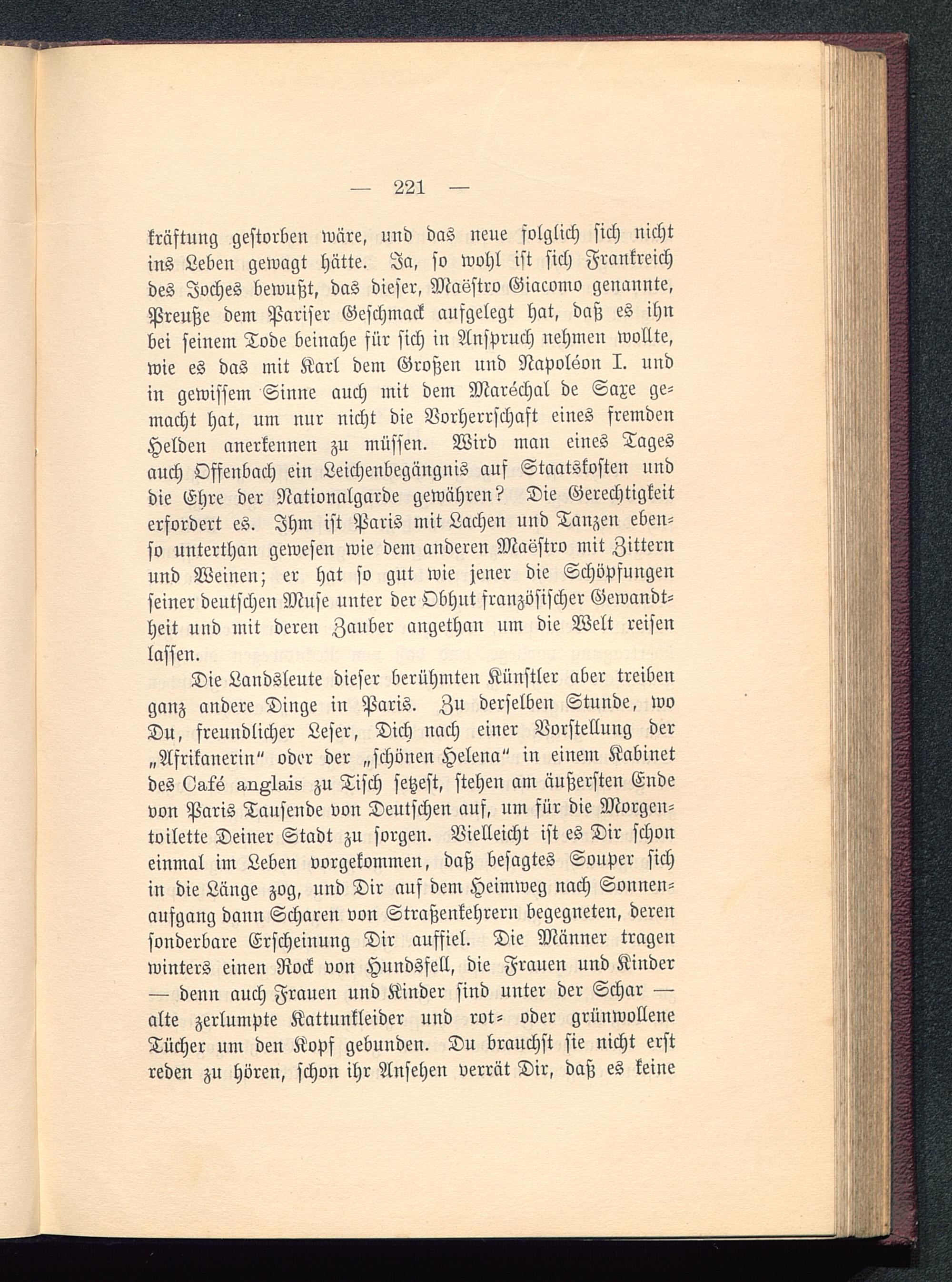 kräftung gestorben Ware, und das neue folglich sich nichtins Leben gewagt hätte. Ja, so Wohl ist sich Frankreich des Joches bewußt, das dieser, Masstro Giacomo genannte,Preuße dem Pariser Geschmack aufgelegt hat, daß es ihnbei seinem Tode beinahe für sich in Anspruch nehmen wollte,wie es das mit Karl dem Großen nnd Napoleon I. undin gewissem Sinne auch mit dem Marschal de Saxe ge-macht hat, um nur nicht die Vorherrschaft eines fremdenHelden anerkennen zu muffen. Wird man eines Tagesauch Offenbach ein Leichenbegängnis auf Staatskosten unddie Ehre der Nationalgarde gewähren? Die Gerechtigkeiterfordert es. Ihm ist Paris mit Lachen und Tanzen eben-so Unterthan gewesen wie dem anderen Masstro mit Zitternund Weinen; er hat so gut wie jener die Schöpfungenseiner deutschen Muse unter der Obhut französischer Gewandt-heit und mit deren Zauber angethan lim die Welt reisenlassen.