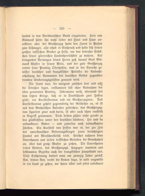 landes in den Norddeutschen Bund einzutreten. Herr vonBismarck hätte ihn Wohl lieber mit Haut und Haar an-nektiert, aber der Großherzog hatte den Zaren in Personzum Schwager, also erhob er Einspruch und holte sich seinengroßen russischen Bruder zu Hilfe, um das bedrohte Stück-chen seiner glorreichen Landesherrlichkeit zu wahren. Aufdringendes Verlangen seines Herrn goß darauf Graf Bis-marck Wasser in seinen Wein, und der gute Großherzogrettete seine Provinz Oberhessen, was in der Sprache ge-wisser deutscher und französischer Politiker die Aufrecht-erhaltung der Autonomie des deutschen Volkes gegenüberfremden Eroberungsgelüsten genannt wird.