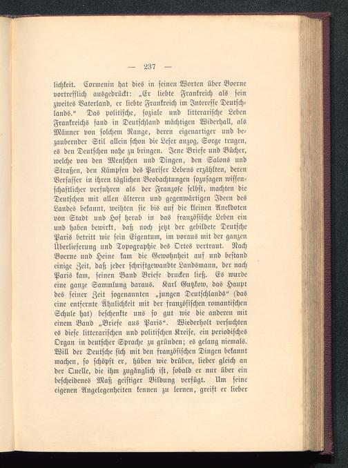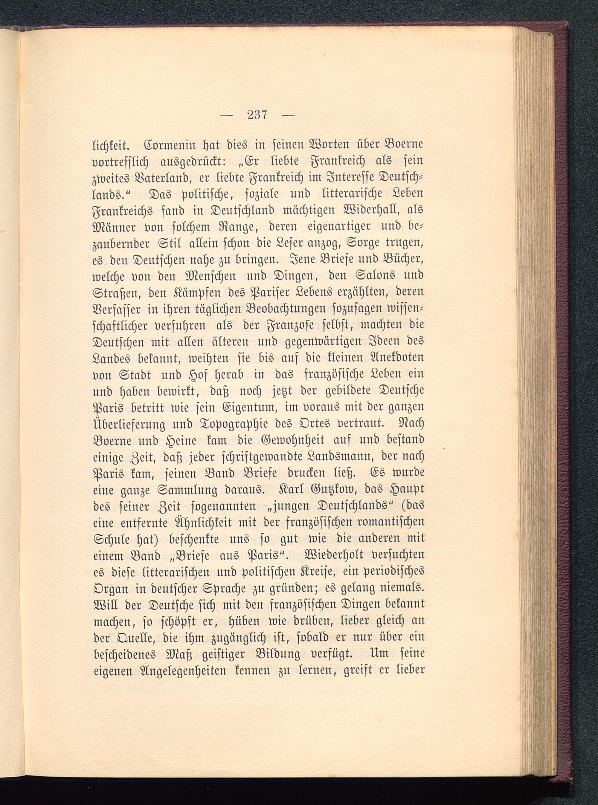 lichkeit. Cormenin hat dies in seinen Worten über Boernevortrefflich ausgedrückt: „Er liebte Frankreich als seinzweites Vaterland, er liebte Frankreich im Interesse Deutsch-lands ." Das politische, soziale und litterarische LebenFrankreichs fand in Deutschland mächtigen Widerhall, alsMänner von solchem Range, deren eigenartiger und be-zaubernder Stil allein schon die Leser anzog, Sorge trugen,es den Deutschen nahe zu bringen. Jene Briefe und Bücher,welche von den Menschen und Dingen, den Salons undStraßen, den Kämpfen des Pariser Lebens erzählten, derenVerfasser in ihren täglichen Beobachtungen sozusagen wissen-schaftlicher verfuhren als der Franzose selbst, machten dieDeutschen mit allen älteren und gegenwärtigen Ideen desLandes bekannt, weihten sie bis auf die kleinen Anekdotenvon Stadt und Hof herab in das französische Leben einund haben bewirkt, daß noch jetzt der gebildete Deutsche Paris betritt wie sein Eigentum, im voraus mit der ganzenÜberlieferung und Topographie des Ortes vertraut. NachBoerne und Heine kam die Gewohnheit auf und bestandeinige Zeit, daß jeder schriftgewaudte Landsmann, der nachParis kam, seinen Band Briefe drucken ließ. Es wurdeeine ganze Sammlung daraus. Karl Gutzkow , das Hauptdes seiner Zeit sogenannten „jungen Deutschlands " (daseine entfernte Ähnlichkeit mit der französischen romantischenSchule hat) beschenkte uns so gut wie die anderen miteinem Band „Briefe aus Paris". Wiederholt versuchtenes diese litterarischen und politischen Kreise, ein periodischesOrgan in deutscher Sprache zu gründen; es gelang niemals.Will der Deutsche sich mit den französischen Dingen bekanntmachen, so schöpft er, hüben wie drüben, lieber gleich ander Quelle, die ihm zugänglich ist, sobald er nur über einbescheidenes Maß geistiger Bildung verfügt. Um seineeigenen Angelegenheiten kennen zu lernen, greift er lieber