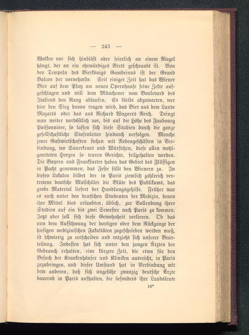 Wolken vor sich hinbläst oder feierlich an einem Riegelhängt, der an ein ehrwürdiges Brett geschraubt ist. Vonden Tempeln des Bierkönigs Gambrinus ist der GrandBalcon der vornehmste. Seit einiger Zeit hat das WienerBier auf dem Platz am neuen Opernhause seine Zelte auf-geschlagen und will dem Münchener vom Boulevard desItaliens deu Rang ablaufen. Es bleibt abzuwarten, werhier den Sieg davon tragen wird, das Bier aus dem LandeMozarts oder das aus Richard Wagners Reich. Dringtman weiter nordöstlich vor, bis auf die Höhe des FaubourgPoissonnisre, so lassen sich diese Studien durch die gauzegesellschaftliche Stufenleiter hindurch verfolgen. Manchejener Gastwirtschaften stehen mit Nebengeschäften in Ver-bindung, wo Sauerkraut und Würstchen, diese allen wohl-gearteten Herzen so teuren Gerichte, feilgehalten werden.Die Bayern und Frankfurter haben das Gebiet des Flüssigenin Pacht genommen, das Feste füllt den Wienern zu. Indiesen Lokalen bildet der in Paris ziemlich zahlreich ver-tretene deutsche Malschüler die Blüte des Publikums, dasgrobe Material liefert der Haudlungsgehilfe. Früher wares auch unter den deutschen Studenten der Medizin, denenihre Mittel dies erlaubten, üblich, zur Vollendung ihrerStudien auf ein bis zwei Semester nach Paris zu kommen.Jetzt aber soll sich diese Gewohnheit verlieren. Ob dasnun dem Aufschwung der dortigen oder dem Rückgange derhiesigen medizinischen Fakultäten zugeschrieben werden muß,ist schwierig zu entscheiden und entzieht sich unserer Beur-teilung. Indessen hat sich unter den jungen Ärzten derGebrauch erhalten, eine kürzere Zeit, die etwa für denBesuch der Krankenhäuser und Kliniken ausreicht, in Paris zuzubringen, und dieser Umstand hat in Verbindung mitdem anderen, daß sich ungefähr zwanzig deutsche Ärztedauernd in Paris aufhalten, die besonders ihre Landsleute