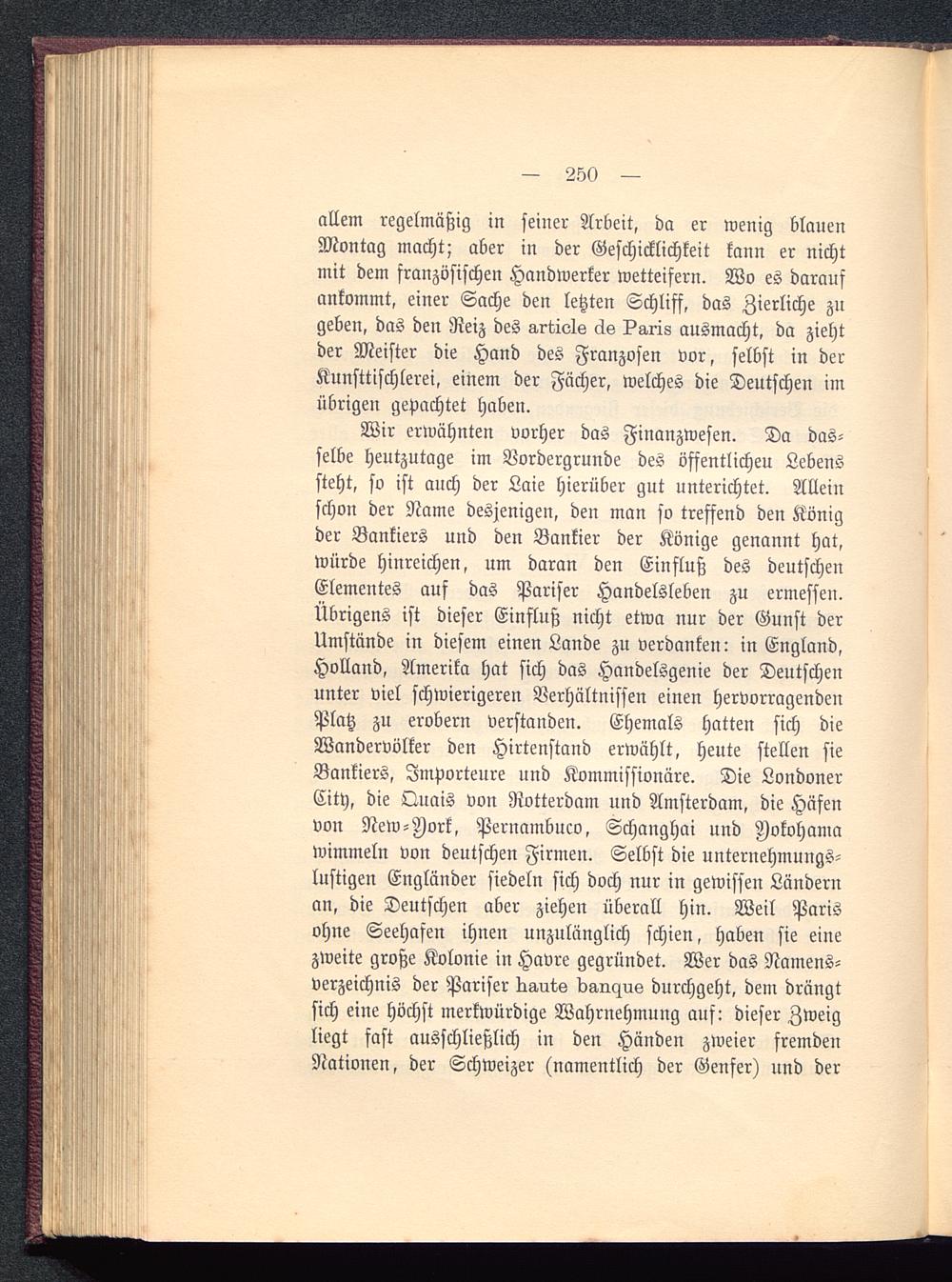 Wir erwähnten vorher das Finanzwesen. Da das-selbe heutzutage im Vordergrunde des öffentlichen Lebenssteht, so ist auch der Laie hierüber gut unterichtet. Allemschon der Name desjenigen, den man so treffend den Königder Bankiers und den Bankier der Könige genannt hat,würde hinreichen, um daran den Einfluß des deutschenElementes auf das Pariser Handelsleben zu ermessen.Übrigens ist dieser Einfluß nicht etwa nur der Gunst derUmstände in diesem einen Lande zu verdanken: in England ,Holland, Amerika hat sich das Handelsgenie der Deutschenunter viel schwierigeren Verhältnissen einen hervorragendenPlatz zu erobern verstanden. Ehemals hatten sich dieWandervölker den Hirtenstand erwählt, heute stellen sieBankiers, Importeure und Kommissionäre. Die LondonerCity, die Quais von Rotterdam und Amsterdam , die Häfenvon New-Iork, Pernambuco, Schanghai und Jokohama wimmeln von deutschen Firmen. Selbst die unternehmungs-lustigen Engländer siedeln sich doch nur in gewissen Ländernan, die Deutschen aber ziehen überall hin. Weil Paris ohne Seehafen ihnen unzulänglich schien, haben sie einezweite große Kolonie in Havre gegründet. Wer das Namens-verzeichnis der Pariser kg,uw daraus durchgeht, dem drängtsich eine höchst merkwürdige Wahrnehmung auf: dieser Zweigliegt fast ausschließlich in den Händen zweier fremdenNationen, der Schweizer (namentlich der Genfer ) und der