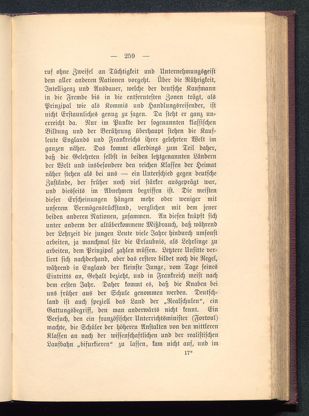 ruf ohne Zweifel an Tüchtigkeit und Unternehmungsgeistdem aller anderen Nationen vorgeht. Über die Rührigkeit,Intelligenz und Ausdauer, welche der deutsche Kaufmannin die Fremde bis in die entferntesten Zonen trägt, alsPrinzipal wie als Kommis und Handlungsreisender, istnicht Erstaunliches genug zu sagen. Da steht er ganz un-erreicht da. Nur im Punkte der sogenannten klassischenBildung und der Berührung überhaupt stehen die Kauf-leute Englands und Frankreichs ihrer gelehrten Welt imganzen näher. Das kommt allerdings zum Teil daher,daß die Gelehrten selbst in beiden letztgenannten Ländernder Welt und insbesondere den reichen Klassen der Heimatnäher stehen als bei uns — ein Unterschied gegen deutscheZustände, der früher noch viel stärker ausgeprägt war,und diesseits im Abnehmen begriffen ist. Die meistendieser Erscheinungen hängen mehr oder weniger mitunserem Vermögensrückstand, verglichen mit dem jenerbeiden anderen Nationen, zusammen. An diesen knüpft sichunter anderm der altüberkommene Mißbrauch, daß währendder Lehrzeit die jungen Leute viele Jahre hindurch umsonstarbeiten, ja manchmal für die Erlaubnis, als Lehrlinge zuarbeiten, dem Prinzipal zahlen müssen. Letztere Unsitte ver-liert sich nachderhand, aber das erstere bildet noch die Regel,während in England der kleinste Junge, vom Tage seinesEintritts an, Gehalt bezieht, und in Frankreich meist nachdem ersten Jahr. Daher kommt es, daß die Knaben beiuns früher aus der Schule genommen werden. Deutsch-land ist auch speziell das Land der „Realschulen", einGattungsbegriff, den man anderwärts nicht kennt. EinVersuch, den ein französischer Unterrichtsminister (Fortoul)machte, die Schüler der höheren Anstalten von den mittlerenKlassen an nach der wissenschaftlichen und der realistischenLaufbahn „bifurkieren" zu lassen, kam nicht auf, und im