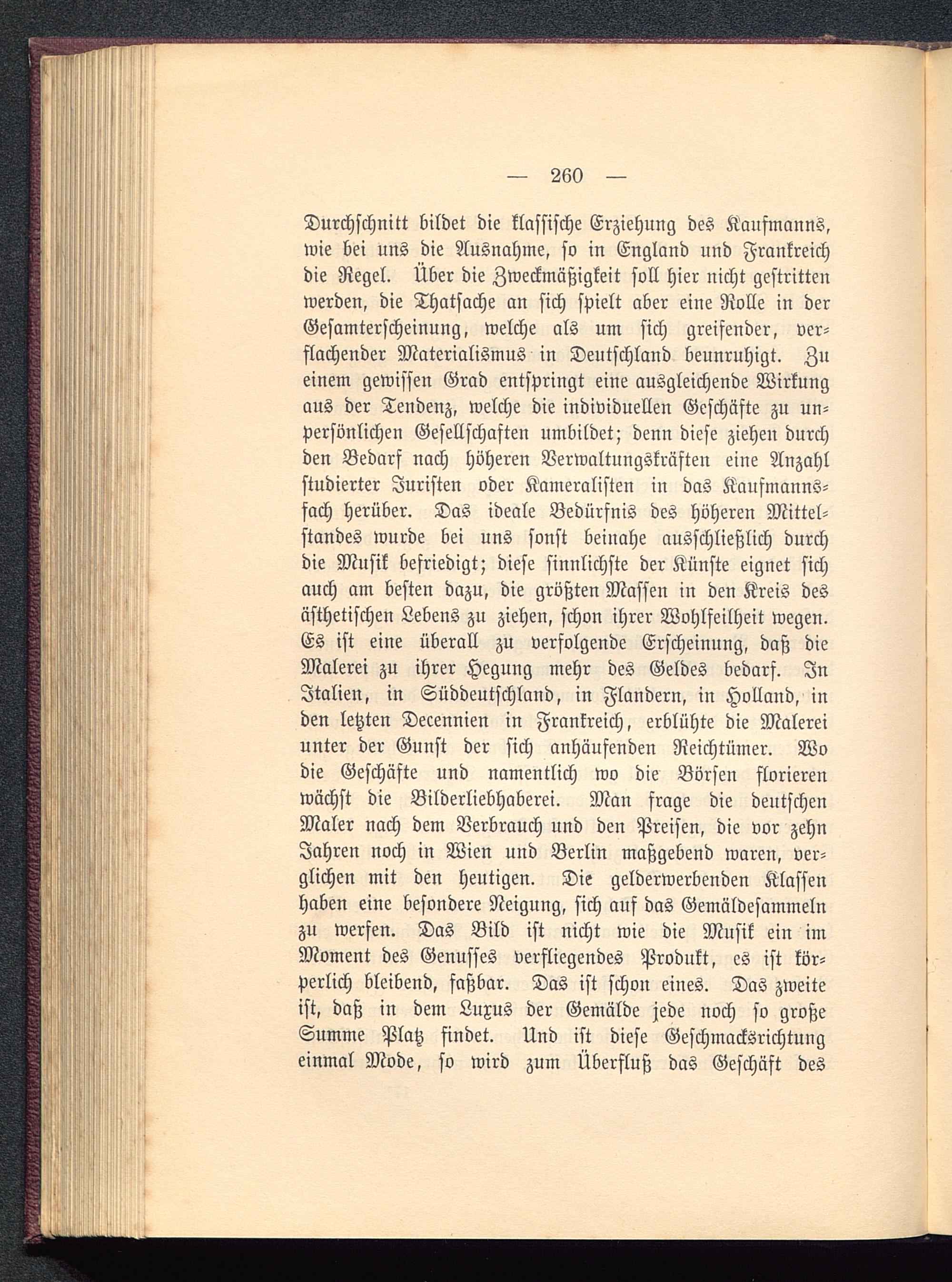 Durchschnitt bildet die klassische Erziehung des Kaufmanns,wie bei uns die Ausnahme, so in England und Frankreich die Regel. Über die Zweckmäßigkeit soll hier nicht gestrittenwerden, die Thatsache an sich spielt aber eine Rolle in derGesamterscheinung, welche als um sich greifender, ver-flachender Materialismus in Deutschland beunruhigt. Zueinem gewissen Grad entspringt eine ausgleichende Wirkungaus der Tendenz, welche die individuellen Geschäfte zu un-persönlichen Gesellschaften umbildet; denn diese ziehen durchden Bedarf nach höheren Verwaltungskräften eine Anzahlstudierter Juristen oder Kameralisten in das Kaufmanns-fach herüber. Das ideale Bedürfnis des höheren Mittel-standes wurde bei uns sonst beinahe ausschließlich durchdie Musik befriedigt; diese sinnlichste der Künste eignet sichauch am besten dazu, die größten Massen in den Kreis desästhetischen Lebens zu ziehen, schon ihrer Wohlfeilheit wegen.Es ist eine überall zu verfolgende Erscheinung, daß dieMalerei zu ihrer Hegung mehr des Geldes bedarf. InItalien, in Süddeutschland, in Flandern, in Holland , inden letzten Decennien in Frankreich , erblühte die Malereiunter der Gunst der sich anhäufenden Reichtümer. Wodie Geschäfte und namentlich wo die Börsen florierenwächst die Bilderliebhaberei. Man frage die deutschenMaler nach dem Verbrauch und den Preisen, die vor zehnJahren noch in Wien und Berlin maßgebend waren, ver-glichen mit den heutigen. Die gelderwerbenden Klassenhaben eine besondere Neigung, sich auf das Gemäldesammelnzu werfen. Das Bild ist nicht wie die Musik ein imMoment des Genusses verfliegendes Produkt, es ist kör-perlich bleibend, faßbar. Das ist schon eines. Das zweiteist, daß in dem Luxus der Gemälde jede noch so großeSumme Platz findet. Und ist diese Geschmacksrichtungeinmal Mode, so wird zum Überfluß das Geschäft des
