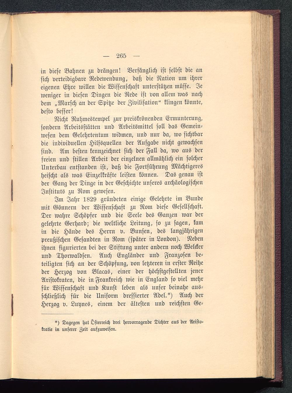 Im Jahr 1829 gründeten einige Gelehrte im Bundemit Gönnern der Wissenschaft zu Rom diese Gesellschaft.Der wahre Schöpfer und die Seele des Ganzen war dergelehrte Gerhard; die weltliche Leitung, so zu sagen, kamin die Hände des Herrn v. Bunsen, des langjährigenPreußischen Gesandten in Rom (später in London ). Nebenihnen figurierten bei der Stiftung unter andern noch Welckerund Thorwaldsen. Auch Engländer und Franzosen be-teiligten sich an der Schöpfung, von letzteren in erster Reiheder Herzog von Blacas, einer der höchstgestellten jenerAristokraten, die in Frankreich wie in England so viel mehrfür Wissenschaft und Kunst leben als unser beinahe aus-schließlich für die Uniform dressierter Adel.*) Auch derHerzog v. Luynes, einem der ältesten und reichsten Ge-