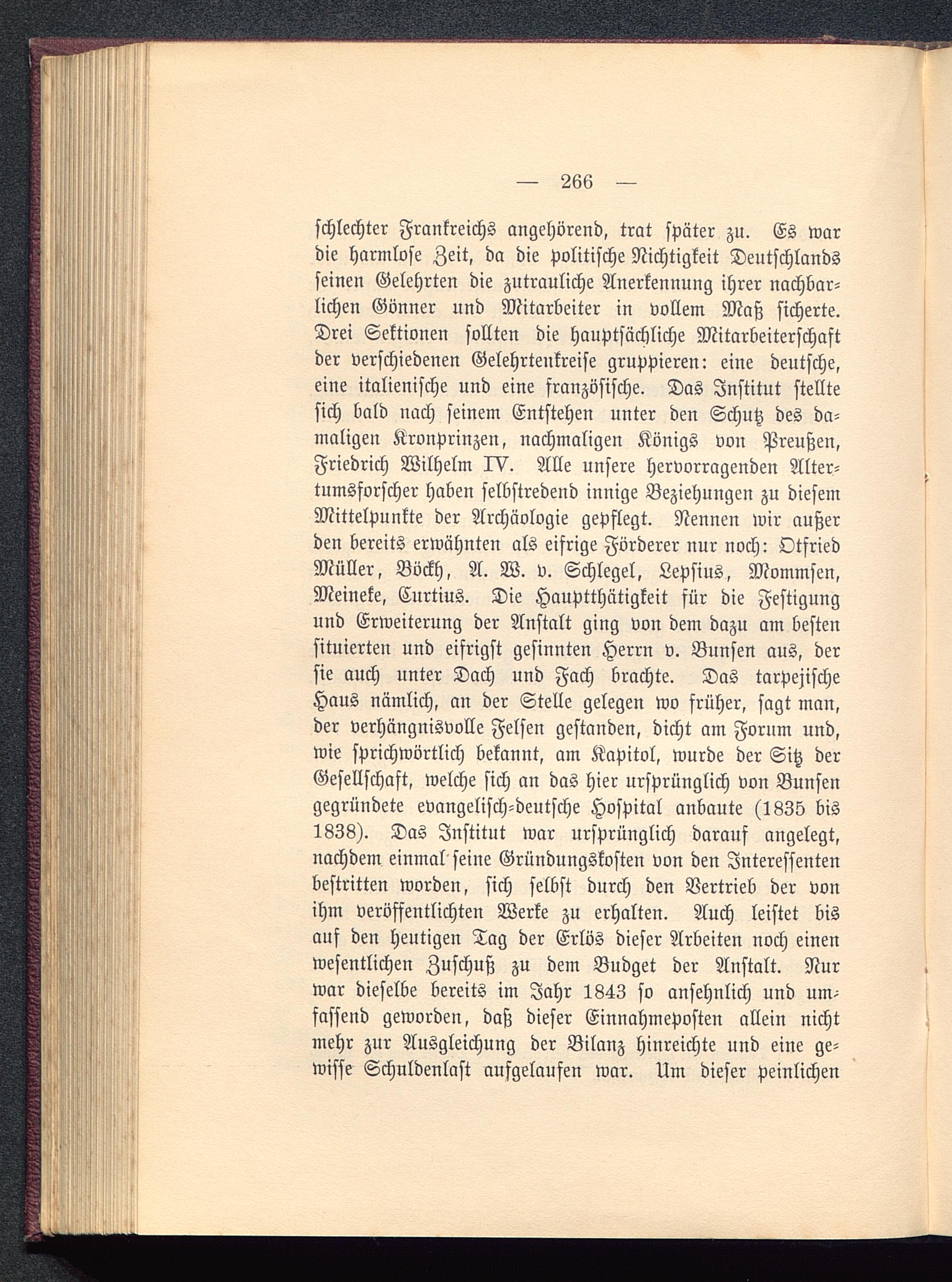 schlechter Frankreichs angehörend, trat später zu. Es wardie harmlose Zeit, da die politische Nichtigkeit Deutschlands seinen Gelehrten die zutrauliche Anerkennung ihrer nachbar-lichen Gönner und Mitarbeiter in vollem Maß sicherte.Drei Sektionen sollten die hauptsächliche Mitarbeiterschaftder verschiedenen Gelehrtenkreise gruppieren: eine deutsche,eine italienische und eine französische. Das Institut stelltesich bald nach seinem Entstehen unter den Schutz des da-maligen Kronprinzen, nachmaligen Königs von Preußen,Friedrich Wilhelm IV. Alle unsere hervorragenden Alter-tumsforscher haben selbstredend innige Beziehungen zu diesemMittelpunkte der Archäologie gepflegt. Nennen wir außerden bereits erwähnten als eifrige Förderer nur noch: OtfriedMüller , Böckh, A. W. v. Schlegel, Lepsius, Mommsen,Meineke, Curtius. Die Hauptthätigkeit für die Festigungund Erweiterung der Anstalt ging von dem dazu am bestensituierten und eifrigst gesinnten Herrn v. Bunsen aus, dersie auch unter Dach und Fach brachte. Das tarpejischeHaus nämlich, an der Stelle gelegen wo früher, sagt man,der verhängnisvolle Felsen gestanden, dicht am Forum und,wie sprichwörtlich bekannt, am Kapital, wurde der Sitz derGesellschaft, welche sich an das hier ursprünglich von Bunsengegründete evangelisch-deutsche Hospital anbaute (1835 bis1838). Das Institut war ursprünglich darauf angelegt,nachdem einmal seine Gründungskosten von den Interessentenbestritten worden, sich selbst durch den Vertrieb der vonihm veröffentlichten Werke zu erhalten. Auch leistet bisauf den heutigen Tag der Erlös dieser Arbeiten noch einenwesentlichen Zuschuß zu dem Budget der Anstalt. Nurwar dieselbe bereits im Jahr 1843 so ansehnlich und um-fassend geworden, daß dieser Einnahmeposten allein nichtmehr zur Ausgleichung der Bilanz hinreichte und eine ge-wisse Schuldenlast aufgelaufen war. Um dieser peinlichen