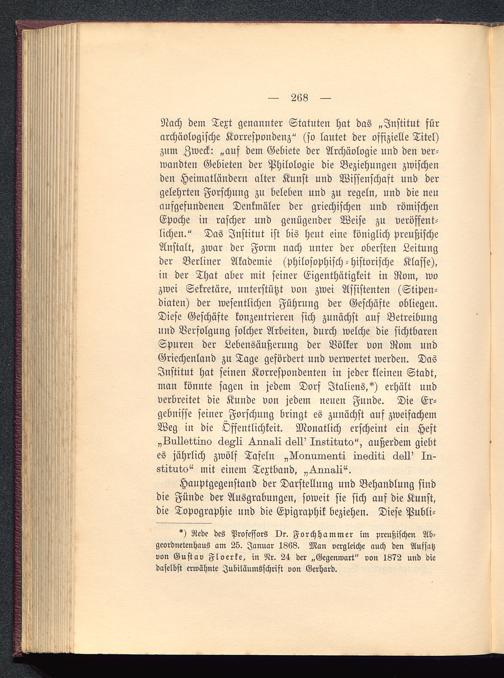 Nach dem Text genannter Statuten hat das „Institut fürarchäologische Korrespondenz" (so lautet der offizielle Titel)zum Zweck: „auf dem Gebiete der Archäologie und den ver-wandten Gebieten der Philologie die Beziehungeil zwischenden Heimatländern alter Kunst und Wissenschaft und dergelehrten Forschung zu beleben und zu regeln, und die neuaufgefundenen Denkmäler der griechischen und römischenEpoche in rascher und genügender Weise zu veröffent-lichen." Das Institut ist bis heut eine königlich preußischeAnstalt, zwar der Form nach unter der obersten Leitungder Berliner Akademie (philosophisch-historische Klasse),in der That aber mit seiner Eigenthätigkeit in Rom , wozwei Sekretäre, unterstützt von zwei Assistenten (Stipen-diaten) der wesentlichen Führung der Geschäfte obliegen.Diese Geschäfte konzentrieren sich zunächst auf Betreibungund Verfolgung solcher Arbeiten, durch welche die sichtbarenSpuren der Lebensäußerung der Völker von Rom undGriechenland zu Tage gefördert und verwertet werden. DasInstitut hat seinen Korrespondenten in jeder kleinen Stadt,man könnte sagen in jedem Dorf Italiens, *) erhält undverbreitet die Kunde von jedem neuen Funde. Die Er-gebnisse seiner Forschung bringt es zunächst auf zweifachemWeg in die Öffentlichkeit. Monatlich erscheint ein Heft„Lullsttirio äsAli ^ims-li Instituts", außerdem giebtes jährlich zwölf Tafelu „Nonvunsiiti insäiti dsll' In-stituto" mit einem Textband, „^.imali".