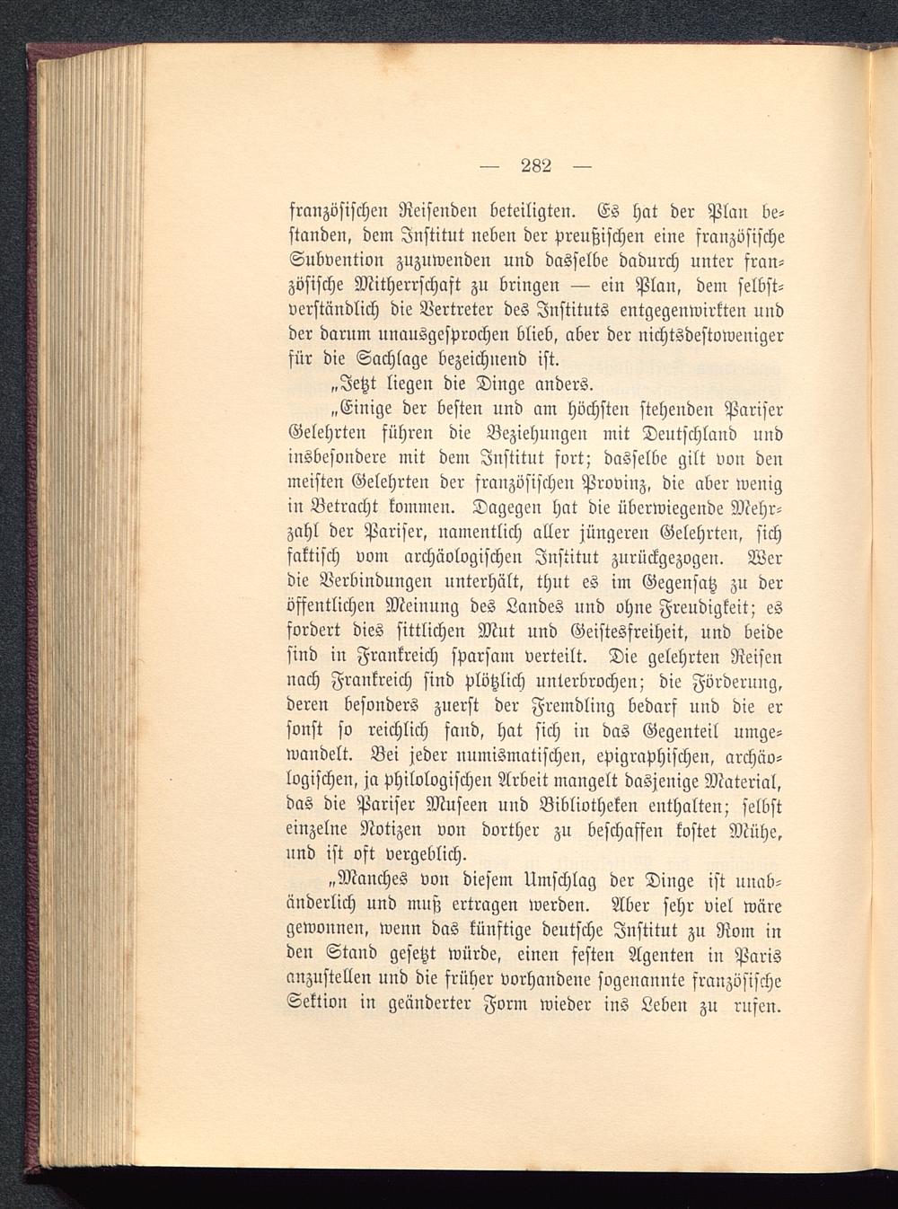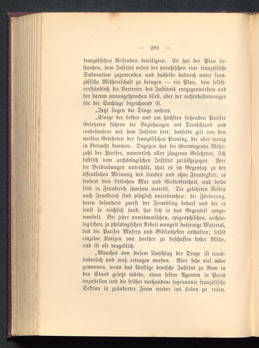 „Einige der besten und am höchsten stehenden Pariser Gelehrten führen die Beziehungen mit Deutschland undinsbesondere mit dem Institut fort; dasselbe gilt von denmeisten Gelehrten der französischen Provinz, die aber wenigin Betracht kommen. Dagegen hat die überwiegende Mehr-zahl der Pariser , namentlich aller jüngeren Gelehrten, sichfaktisch vom archäologischen Institut zurückgezogen. Werdie Verbindungen unterhält, thut es im Gegensatz zu deröffentlichen Meinung des Landes und ohne Freudigkeit; esfordert dies sittlichen Mut und Geistesfreiheit, und beidesind in Frankreich sparsam verteilt. Die gelehrten Reisennach Frankreich sind plötzlich unterbrochen; die Förderung,deren besonders zuerst der Fremdling bedarf und die ersonst so reichlich fand, hat sich in das Gegenteil umge-wandelt. Bei jeder numismatischen, epigraphischen, archäo-logischen, ja philologischen Arbeit mangelt dasjenige Material,das die Pariser Museen und Bibliotheken enthalten; selbsteinzelne Notizen von dorther zu beschaffen kostet Mühe,und ist oft vergeblich.