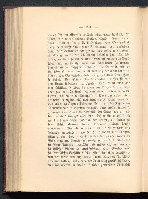 wo es sich um historisch volkstümlichen Sinn handelt, derihnen, wie keiner anderen Nation, abgeht. Ganz umge-kehrt verhält es sich z. B. in Italien. Von Griechenland weiß ich es nicht aus eigener Anschauung, doch versichernkompetente Beobachter das gleiche, was meine und andererErfahrung mir an den Italienern bekundet hat. Da lebtdas ganze Volk, soweit es nur überhaupt etwas von Denk-leben hat, im Gefühl eines ununterbrochenen Zusammen-hanges mit der klassischen Vorzeit. Die Naivetät, mit dersich jeder für einen direkten Abkömmling der alten Umbrier,Römer oder Großgriechenlünder weiß, hat etwas Komisch-er-freuliches. Von Scipio oder von Titus sprechen sie wievon ihrem leiblichen Urgroßvater, und kommt man garnach Sicilien, so reden sie einem von Archimedes, Dionysoder gar von Odysseus wie von einem vertrauteu altenVetter. Die Kette der Ereignisse ist ihnen gar nicht unter-brochen; ich ergötze mich noch heut an der Erinnerung derSituation, da Signor Salvatore Politi, mir die Reste einesDianentempels in Syrakus zeigend, ganz trocken hinwarf:„Damals war Diana die Patronin der Stadt, wie es seit-dem Santa Lueia geworden ist." Ich mußte unwillkürlichan die frauzösischeu Ladenschilder denken, auf denen zulesen steht: Na-isoir Diana, Ns-Zaras Lairits Duoissuecssssur. Bei solch offenem Sinn für die Historie undLegende, in Ländern, wo der dritte Mann mit Antiqui-täten zu thun hat, gewinnt offenbar die fremde Nation anBedeutung und Zuneigung, welche sich an Ort und Stellein Form Rechtens niederläßt und ausbreitet, um den ge-schichtlichen Boden zu durchforschen. Prof. Forchhammerschildert dieses Verhältnis sehr lebhaft in seiner bereits er-wähnten Rede, und fügt hinzu: man würde es für Über-treibung halten, wollte er seiner Erfahrung gemäß schildern,wie die überall in Italien kundbar gewordene Thätigkeit