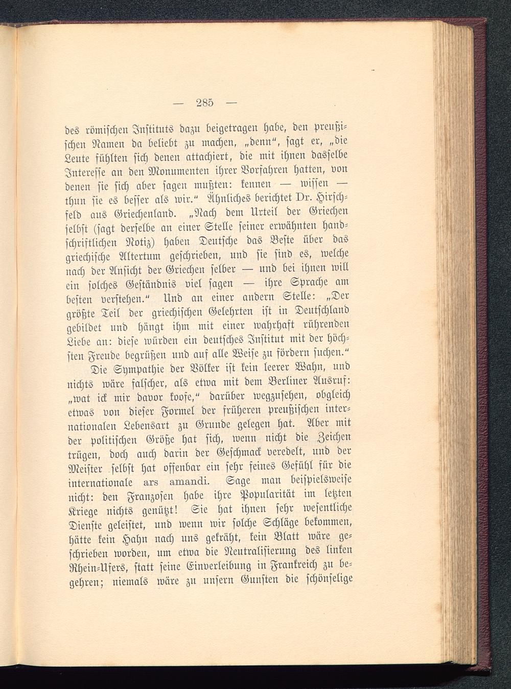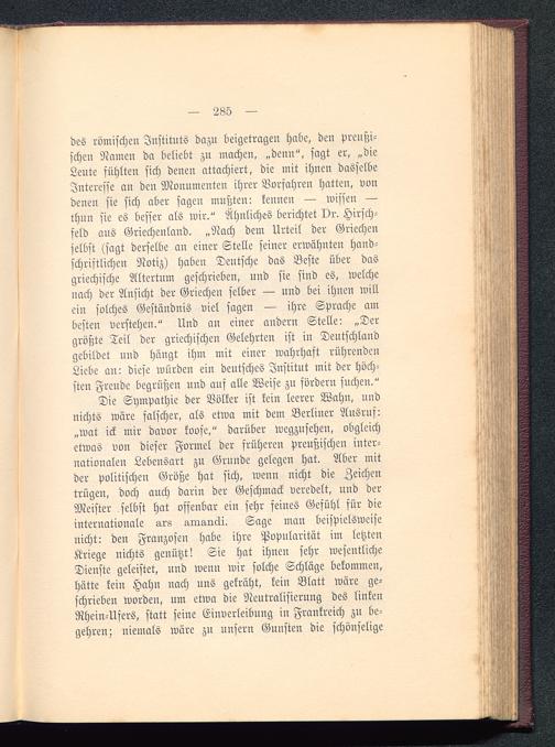 des römischen Instituts dazu beigetragen habe, den Preußi-schen Namen da beliebt zu machen, „denn", sagt er, „dieLeute fühlten sich deuen attachiert, die mit ihnen dasselbeInteresse an den Monumenten ihrer Vorfahren hatten, vondenen fie sich aber sagen mußten: kennen — missen —thnn sie es besser als wir." Ähnliches berichtet vr. Hirsch-feld aus Griechenland . „Nach dem Urteil der Griechenselbst (sagt derselbe an einer Stelle seiner erwähnten hand-schriftlichen Notiz) haben Deutsche das Beste über dasgriechische Altertum geschrieben, und sie sind es, welchenach der Ansicht der Griechen selber — und bei ihnen willein solches Gestäudnis viel sagen — ihre Sprache ambesten verstehen." Und an einer andern Stelle: „Dergrößte Teil der griechischen Gelehrten ist in Deutschland gebildet uud hangt ihm mit einer wahrhaft rührendenLiebe an: diese würden ein deutsches Institut mit der höch-sten Freude begrüßen und ans alle Weise zu fördern suchen."