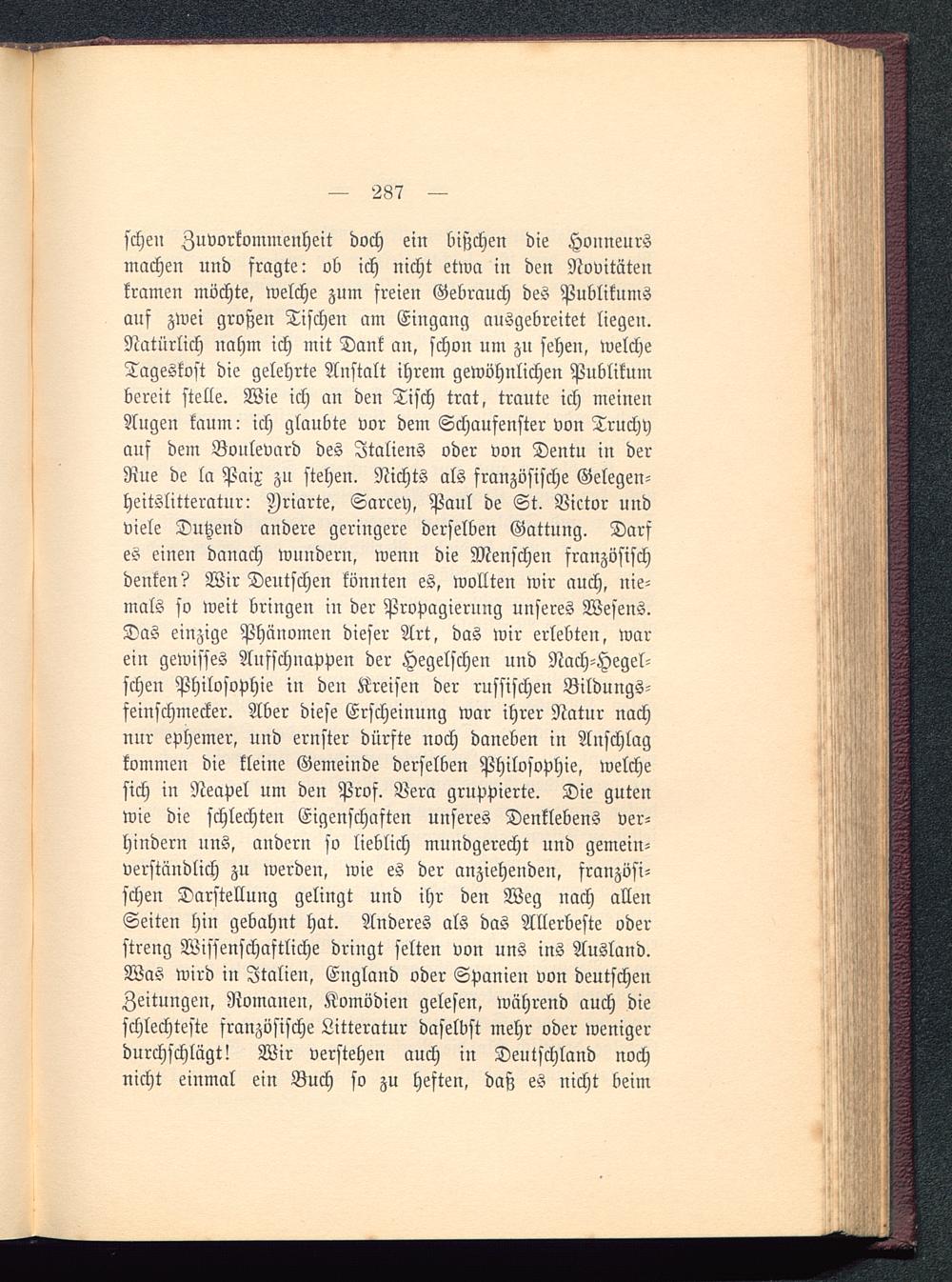 schen Zuvorkommenheit doch ein bißchen die Honneursmachen und fragte: ob ich nicht etwa in den Novitätenkramen möchte, welche zum freien Gebrauch des Publikumsauf zwei großen Tischen am Eingang ausgebreitet liegen.Natürlich nahm ich mit Dank an, schon um zu sehen, welcheTageskost die gelehrte Anstalt ihrem gewöhnlichen Publikumbereit stelle. Wie ich au den Tisch trat, traute ich meinenAugen kaum: ich glaubte vor dem Schaufenster von Trnchyauf dem Boulevard des Italiens oder von Dentu in derRue de la Paix zu stehen. Nichts als französische Gelegen-heitslitteratur: Iriarte, Sarcey, Paul de St. Victor undviele Dutzend andere geringere derselben Gattung. Darfes eineu danach wundern, wenn die Menschen französischdenken? Wir Deutschen könnten es, wollten wir auch, nie-mals so weit bringen in der Propagiernng unseres Wesens.Das einzige Phänomen dieser Art, das wir erlebten, warein gewisses Aufschnappen der Hegelschen und Nach-Hegel-schen Philosophie in den Kreisen der russischen Bildungs-feinschmecker. Aber diese Erscheinung war ihrer Natur nachnur ephemer, und ernster dürfte noch daneben in Anschlagkommen die kleine Gemeinde derselben Philosophie, welchesich in Neapel um den Prof. Vera gruppierte. Die gutenwie die schlechten Eigenschaften unseres Denklebens ver-hindern uns, andern so lieblich mundgerecht und gemein-verständlich zu werden, wie es der anziehenden, französi-schen Darstellung gelingt und ihr den Weg nach allenSeiten hin gebahnt hat. Anderes als das Allerbeste oderstreng Wissenschaftliche dringt selten von uns ins Ausland.Was wird in Italien, England oder Spanien von deutschen Zeitungen, Romanen, Komödien gelesen, während auch dieschlechteste französische Litteratur daselbst mehr oder wenigerdurchschlägt! Wir verstehen auch in Deutschland nochnicht einmal ein Buch so zu heften, daß es nicht beim