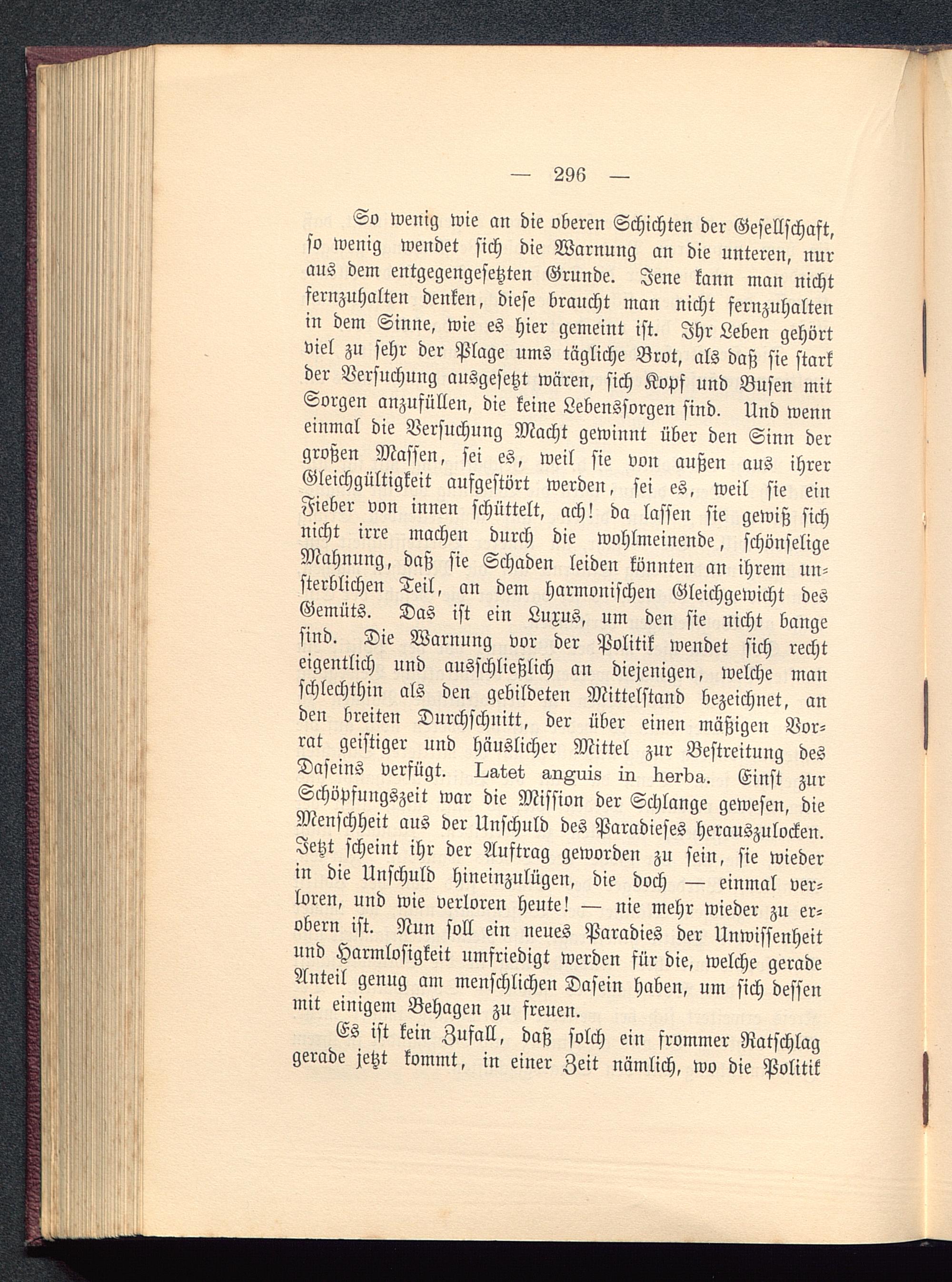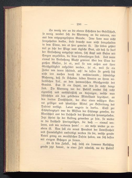 So wenig wie an die oberen Schichten der Gesellschaft,so wenig wendet sich die Warnung an die unteren, nuraus dem entgegengesetzten Grunde. Jene kann man nichtfernzuhalten denken, diese braucht man nicht fernzuhaltenin dem Sinne, wie es hier gemeint ist. Ihr Leben gehörtviel zu sehr der Plage ums tägliche Brot, als daß sie starkder Versuchung ausgesetzt wären, sich Kopf und Busen mitSorgen anzufüllen, die keine Lebenssorgen sind. Und wenneinmal die Versuchung Macht gewinnt über den Sinn dergroßen Massen, sei es, weil sie von außen aus ihrerGleichgültigkeit aufgestört werden, sei es, weil sie einFieber von innen schüttelt, ach! da lassen sie gewiß sichnicht irre machen durch die wohlmeinende, schönseligeMahnung, daß sie Schaden leiden könnten an ihrem un-sterblichen Teil, an dem harmonischen Gleichgewicht desGemüts. Das ist ein Luxus, um den sie nicht bangesind. Die Warnung vor der Politik wendet sich rechteigentlich und ausschließlich an diejenigen, welche manschlechthin als den gebildeten Mittelstand bezeichnet, anden breiten Durchschnitt, der über einen mäßigen Vor-rat geistiger und häuslicher Mittel zur Bestreitung desDaseins verfügt. I^atst a-riAuis in. tisrda. Einst zurSchöpfungszeit war die Mission der Schlange gewesen, dieMenschheit aus der Unschuld des Paradieses herauszulocken.Jetzt scheint ihr der Auftrag geworden zu fein, sie wiederin die Unschuld hineinzulügen, die doch — einmal ver-loren, und wie verloren heute! — nie mehr wieder zu er-obern ist. Nun soll ein neues Paradies der Unwissenheitund Harmlosigkeit umfriedigt werden für die, welche geradeAnteil genug am menschlichen Dasein haben, um sich dessenmit einigem Behagen zu freuen.