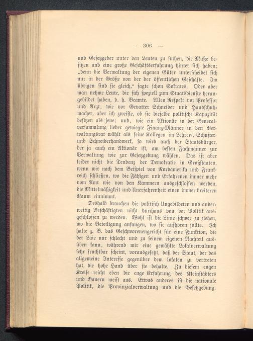 und Gesetzgeber unter den Leuten zu suchen, die Muße be-sitzen und eine große Geschäftserfahrung hinter sich haben;„denn die Verwaltung der eigenen Güter unterscheidet sichnur in der Größe von der der öffentlichen Geschäfte. Imübrigen sind sie gleich," sagte schon Sokrates. Oder aberman nehme Leute, die sich speziell zum Staatsdienste heran-gebildet haben, d. h. Beamte. Allen Respekt vor Professorund Arzt, wie vor Gevatter Schneider und Handschuh-macher, aber ich zweifle, ob sie dieselbe politische Kapazitätbesitzen als jene; und, wie ein Aktionär in der General-versammlung lieber gewiegte Finanz-Männer in den Ver-waltungsrat wählt als seine Kollegen im Lehrer-, Schuster-und Schneiderhandwerk, so wird auch der Staatsbürger,der ja auch ein Aktionär ist, am besten Fachmänner zurVerwaltung wie zur Gesetzgebung wählen. Das ist aberleider nicht die Tendenz der Demokratie in Großstaaten,wenn wir nach dem Beispiel von Nordamerika und Frank-reich schließen, wo die Fähigen und Erfahrenen immer mehrvom Amt wie von den Kammern ausgeschlossen werden,die Mittelmäßigkeit und Unerfahrenheit einen immer breiterenRaum einnimmt.