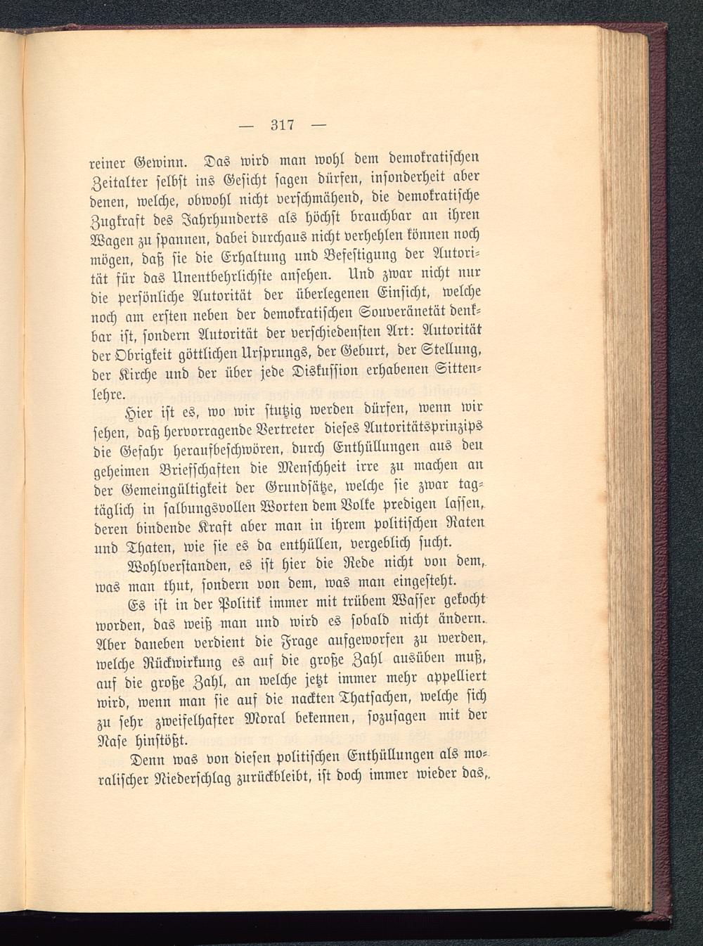 Hier ist es, wo wir stutzig werden dürfen, wenn wirsehen, daß hervorragende Vertreter dieses Autoritätsprinzipsdie Gefahr heraufbeschwören, durch Enthüllungen aus dengeheimen Briefschaften die Menschheit irre zu machen ander Gemeingültigkeit der Grundsätze, welche sie zwar tag-täglich in salbungsvollen Worten dem Volke predigen lassen,deren bindende Kraft aber man in ihrem politischen Ratenund Thaten, wie sie es da enthüllen, vergeblich sucht.