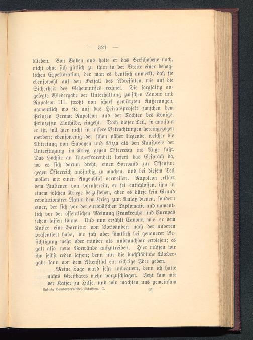 blieben. Von Baden aus holte er das Verschobene nach,nicht ohne sich gütlich zu thun in der Breite einer behag-lichen Expektoration, der man es deutlich anmerkt, daß sieebensowohl auf den Beifall des Adressaten, wie auf dieSicherheit des Geheimnisses rechnet. Die sorgfältig an-gelegte Wiedergabe der Unterhaltung zwischen Cavour undNapoleon III. strotzt von scharf gewürzten Äußerungen,namentlich wo sie aus das Heiratsprojekt zwischen demPrinzen Jerome Napoleon und der Tochter des Königs,Prinzessin Clothilde , eingeht. Doch dieser Teil, so amüsanter ist, soll hier nicht in unsere Betrachtungen hereingezogenwerden; ebensowenig der schon näher liegende, welcher dieAbtretung von Savoyen und Nizza als den Kaufpreis derUnterstützung im Krieg gegen Osterreich ins Auge faßt.Das Höchste an Unverfrorenheit liefert das Gespräch da,wo es sich darum dreht, eiuen Vorwand zur Offensivegegen Osterreich ausfindig zu machen, und bei diesem Teilwollen wir einen Augenblick verweilen. Napoleon erklärtdem Italiener von vornherein, er sei entschlossen, ihm ineinem solchen Kriege beizustehen, aber es dürfe kein Grundrevolutionärer Natur dem Krieg zum Anlaß dienen, fonderneiner, der sich vor der europäischen Diplomatie und nament-lich vor der öffentlichen Meinuug Frankreichs und Europas sehen lassen könne. Und nun erzählt Cavour, wie er demKaiser eiue Garnitur von Vorwänden nach der anderenpräsentiert habe, die sich aber sämtlich bei genauerer Be-sichtigung mehr oder minder als unbrauchbar erwiesen; esgalt also neue Vorwände aufzutreiben. Hier müssen wirihn selbst reden lassen; denn nur die buchstäbliche Wieder-gabe kanu von dem Aktenstück ein richtige Idee geben.