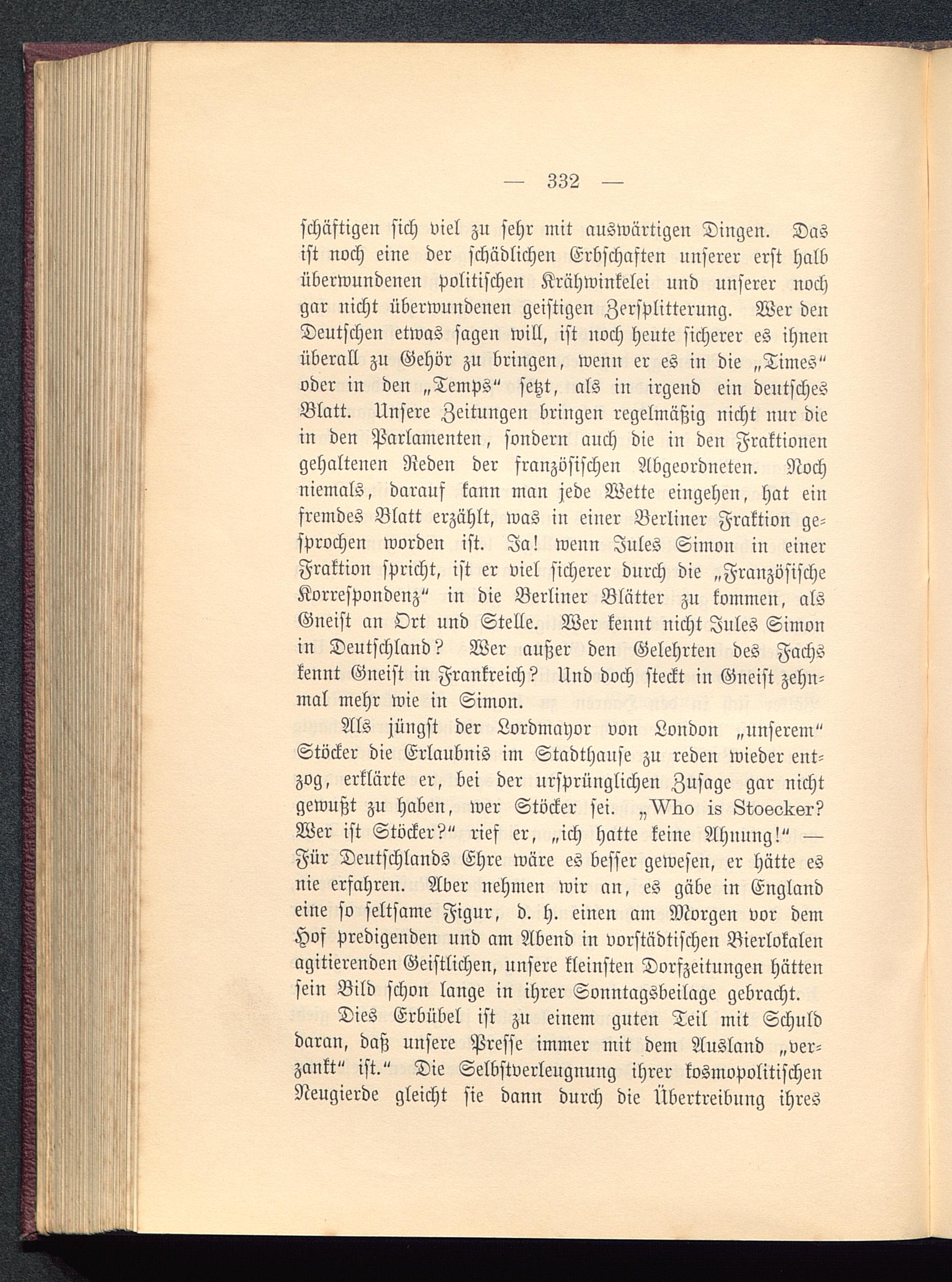 Als jüngst der Lordmayor von London „unserem"Stöcker die Erlaubnis im Stadthause zu reden wieder ent-zog, erklärte er, bei der ursprünglichen Zusage gar nichtgewußt zu haben, wer Stöcker sei. „^Vlio 1s Ltosolcsr?Wer ist Stöcker?" rief er, „ich hatte keine Ahnnng!" —Für Deutschlands Ehre wäre es besser gewesen, er hätte esnie erfahren. Aber uehmen wir an, es gäbe in England eine so seltsame Figur, d. h. einen am Morgen vor demHof predigenden und am Abend in vorstädtischen Bierlokalenagitierenden Geistlichen, unsere kleinsten Dorfzeitungen hättensein Bild schon lange in ihrer Sonntagsbeilage gebracht.