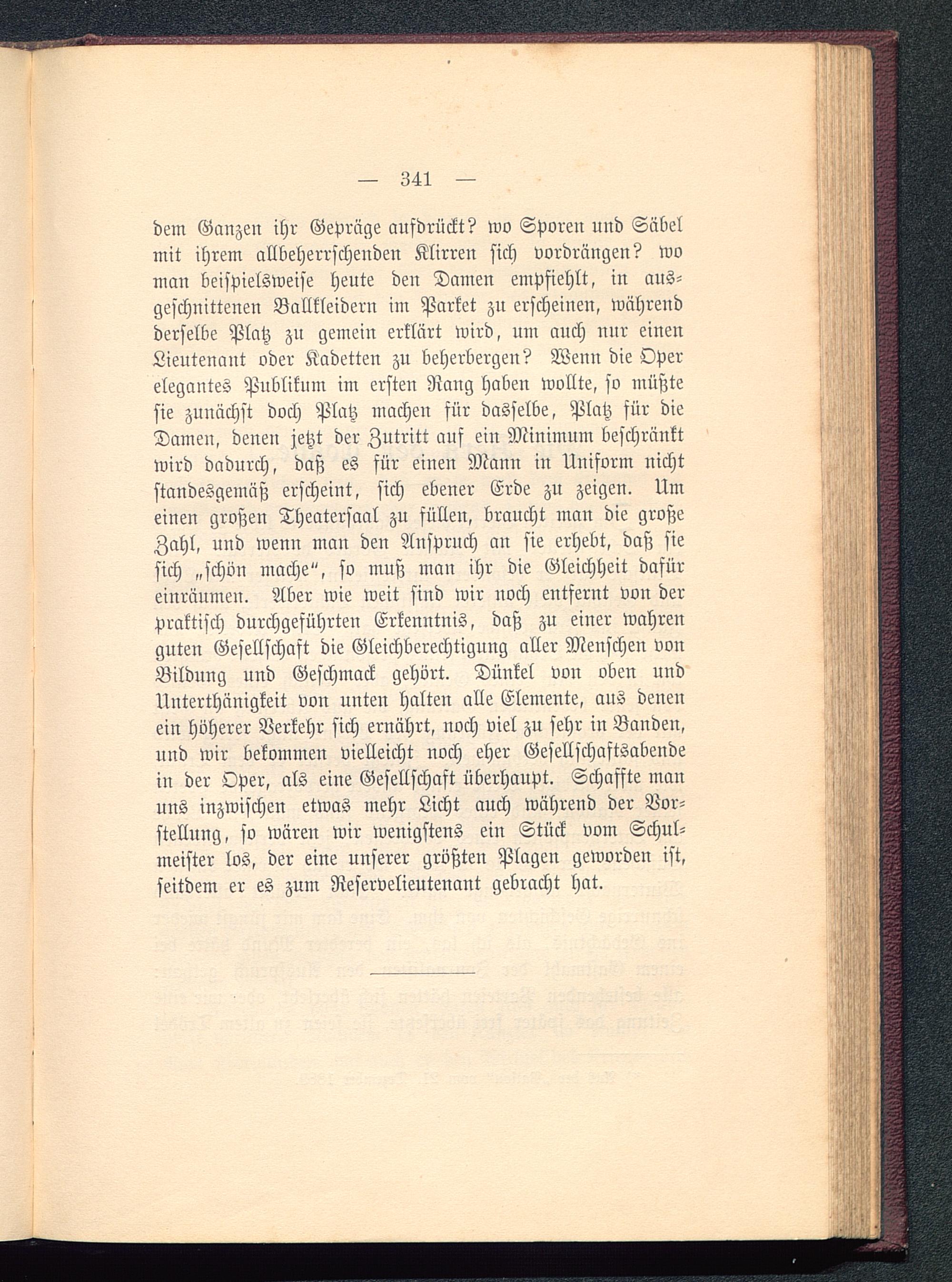 dem Ganzen ihr Gepräge aufdrückt? wo Sporen und Säbelmit ihrem allbeherrschenden Klirren sich vordrängen? woman beispielsweise heute den Damen empfiehlt, in aus-geschnittenen Ballkleidern im Parket zu erscheinen, währendderselbe Platz zn gemein erklärt wird, um auch nur einenLieutenant oder Kadetten zu beherbergen? Wenn die Operelegantes Publikum im ersten Rang haben wollte, so müßtesie zunächst doch Platz machen für dasselbe, Platz für dieDamen, denen jetzt der Zutritt auf ein Minimum beschränktwird dadurch, daß es für einen Mann in Uniform nichtstandesgemäß erscheint, sich ebener Erde zu zeigen. Umeinen großen Theatersaal zu sülleu, braucht man die großeZahl, und wenn man den Anspruch an sie erhebt, daß siesich „schön mache", so muß man ihr die Gleichheit dafüreinräumen. Aber wie weit sind wir noch entfernt von derpraktisch durchgeführten Erkenntnis, daß zu einer wahrenguten Gesellschaft die Gleichberechtigung aller Menschen vonBildung und Geschmack gehört. Dünkel von oben undUnterthänigkeit von unten halten alle Elemente, aus denenein höherer Verkehr sich ernährt, noch viel zu sehr in Banden,und wir bekommen vielleicht noch eher Gesellschaftsabendein der Oper, als eine Gesellschaft überhaupt. Schaffte manuns inzwischen etwas mehr Licht auch während der Vor-stellung, so wären wir wenigstens ein Stück vom Schul-meister los, der eine unserer größten Plagen geworden ist,seitdem er es zum Reservelieutenant gebracht hat.