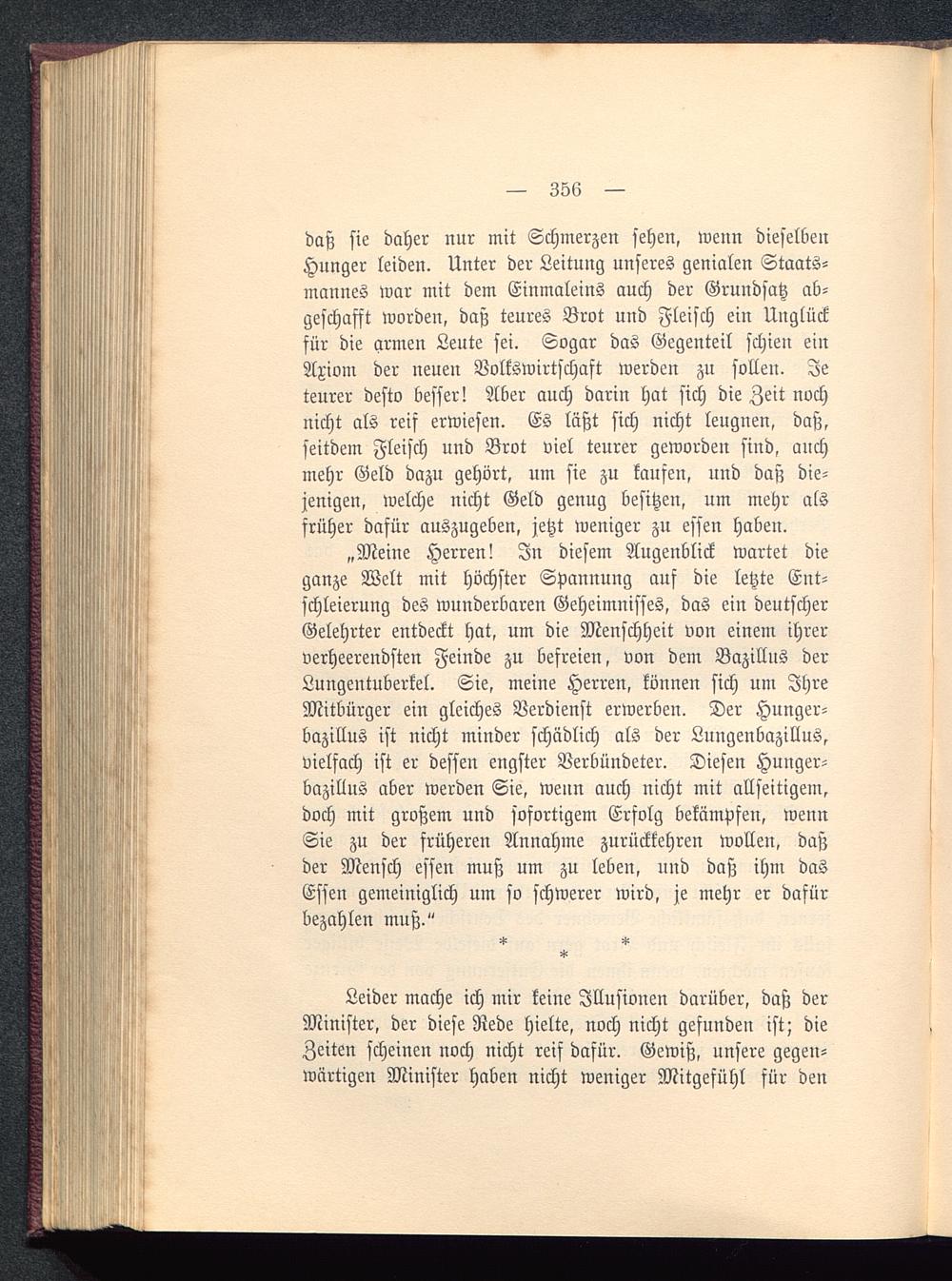„Meine Herren! In diesem Augenblick wartet dieganze Welt mit höchster Spannung auf die letzte Ent-schleierung des wunderbaren Geheimnisses, das ein deutscherGelehrter entdeckt hat, um die Menschheit von einem ihrerverheerendsten Feinde zu befreien, von dem Bazillus derLungentuberkel. Sie, meine Herren, können sich um IhreMitbürger ein gleiches Verdienst erwerben. Der Hunger-bazillus ist nicht minder schädlich als der Lungenbazillus,vielfach ist er dessen engster Verbündeter. Diesen Hunger-bazillus aber werden Sie, weun auch nicht mit allseitigem,doch mit großem und sofortigem Erfolg bekämpfen, wennSie zu der früheren Annahme zurückkehren wollen, daßder Mensch essen muß um zu leben, und daß ihm dasEssen gemeiniglich um so schwerer wird, je mehr er dafürbezahlen muß."