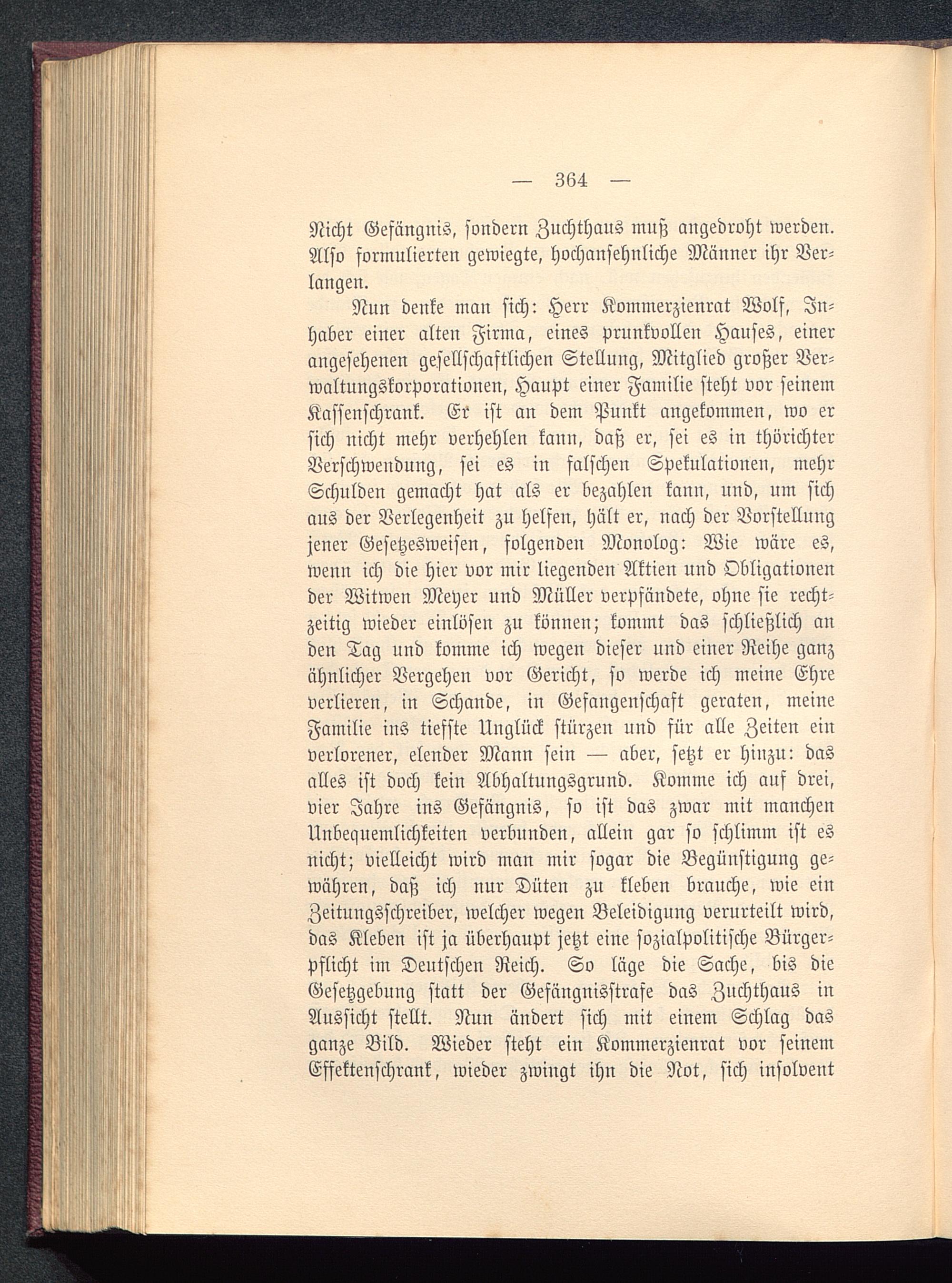 Nun denke man sich: Herr Kommerzienrat Wolf, In-haber einer alten Firma, eines prunkvollen Hauses, einerangesehenen gesellschaftlichen Stellung, Mitglied großer Ver-waltungskorporationen, Haupt einer Familie steht vor seinemKassenschrank. Et ist an dem Punkt angekommen, wo ersich nicht mehr verhehlen kann, daß er, sei es in thörichterVerschwendung, sei es in falschen Spekulationen, mehrSchulden gemacht hat als er bezahlen kann, nnd, um sichaus der Verlegenheit zu helfen, hält er, nach der Vorstellungjener Gesetzesweisen, folgenden Monolog: Wie wäre es,wenn ich die hier vor mir liegenden Aktien und Obligationender Witwen Meyer und Müller verpfändete, ohne sie recht-zeitig wieder einlösen zu können; kommt das schließlich anden Tag und komme ich wegen dieser und einer Reihe ganzähnlicher Vergehen vor Gericht, so werde ich meine Ehreverlieren, in Schande, in Gefangenschaft geraten, meineFamilie ins tiefste Unglück stürzen und für alle Zeiten einverlorener, elender Mann sein — aber, setzt er hinzu: dasalles ist doch kein Abhaltungsgrund. Komme ich auf drei,vier Jahre ins Gefängnis, so ist das zwar mit manchenUnbequemlichkeiten verbunden, allein gar so schlimm ist esnicht; vielleicht wird man mir sogar die Begünstigung ge-währen, daß ich nur Düten zu kleben brauche, wie einZeitungsschreiber, welcher wegen Beleidigung verurteilt wird,das Kleben ist ja überhaupt jetzt eine sozialpolitische Bürger-pflicht im Deutschen Reich. So läge die Sache, bis dieGesetzgebung statt der Gefängnisstrafe das Zuchthaus inAussicht stellt. Nun ändert sich mit einem Schlag dasganze Bild. Wieder steht ein Kommerzienrat vor seinemEffektenschrank, wieder zwingt ihn die Not, sich insolvent