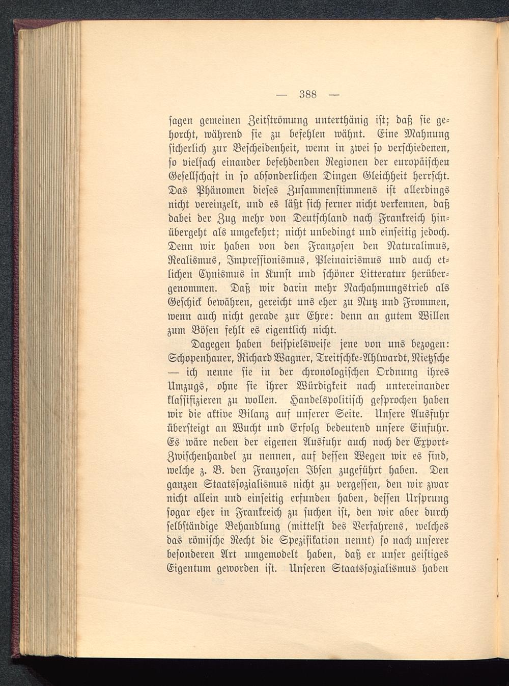 Dagegen haben beispielsweise jene von uns bezogen:Schopenhauer, Richard Wagner , Treitschke-Ahlwardt, Nietzsche— ich nenne sie in der chronologischen Ordnung ihresUmzugs, ohne sie ihrer Würdigkeit nach untereinanderklassifizieren zu wollen. Handelspolitisch gesprochen habenwir die aktive Bilanz auf unserer Seite. Unsere Ausfuhrübersteigt au Wucht und Erfolg bedeutend unsere Einfuhr.Es wäre neben der eigenen Ausfuhr auch noch der Export-Zwischenhandel zu nennen, auf dessen Wegen wir es sind,welche z. B. den Franzosen Ibsen zugeführt haben. Denganzen Staatssozialismns nicht zu vergessen, den wir zwarnicht allein und einseitig erfunden haben, desfen Ursprungsogar eher in Frankreich zu suchen ist, den wir aber durchselbständige Behandlung (mittelst des Verfahrens, welchesdas römische Recht die Spezifikation nennt) so nach unsererbesonderen Art umgemodelt haben, daß er unser geistigesEigentum geworden ist. Unseren Staatssozialismus haben