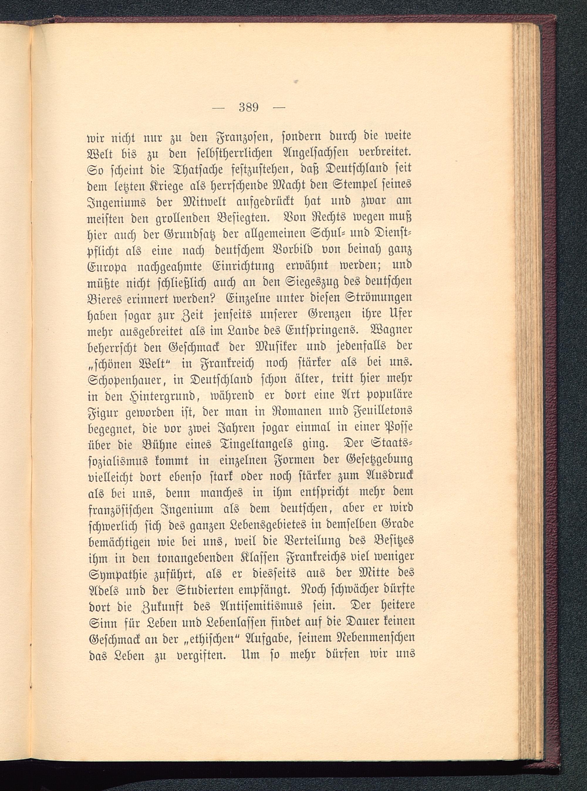 wir nicht nur zu den Franzosen , sondern durch die weiteWelt bis zu den selbstherrlichen Angelsachsen verbreitet.So scheint die Thatsache festzustehen, daß Deutschland seitdem letzten Kriege als herrschende Macht den Stempel seinesIngeniums der Mitwelt aufgedrückt hat und zwar ammeisten den grollenden Besiegten. Von Rechts wegen mußhier auch der Grundsatz der allgemeinen Schul- und Dienst-pflicht als eine nach deutschem Vorbild von beinah ganzEuropa nachgeahmte Einrichtung erwähnt werden; undmüßte nicht schließlich auch an den Siegeszug des deutschenBieres erinnert werden? Einzelne unter diesen Strömungenhaben sogar zur Zeit jenseits unserer Grenzen ihre Ufermehr ausgebreitet als im Lande des Entspringens. Wagnerbeherrscht den Geschmack der Musiker und jedenfalls der„schönen Welt" in Frankreich noch stärker als bei uns.Schopenhauer, in Deutschland schon älter, tritt hier mehrin den Hintergrund, während er dort eine Art populäreFigur geworden ist, der man in Romanen und Feuilletonsbegegnet, die vor zwei Jahren sogar einmal in einer Posseüber die Bühne eines Tingeltangels ging. Der Staats-sozialismus kommt in einzelnen Formen der Gesetzgebungvielleicht dort ebenso stark oder noch stärker zum Ausdruckals bei uns, denn manches in ihm entspricht mehr demfranzösischen Ingenium als dem deutscheu, aber er wirdschwerlich sich des ganzen Lebensgebietes in demselben Gradebemächtigen wie bei uns, weil die Verteilung des Besitzesihm in den tonangebenden Klaffen Frankreichs viel wenigerSympathie zuführt, als er diesseits aus der Mitte desAdels und der Studierten empfängt. Noch schwächer dürftedort die Zukunft des Antisemitismus sein. Der heitereSinn für Leben und Lebenlasfen findet auf die Dauer keinenGeschmack an der „ethischen" Aufgabe, seinem Nebenmenschendas Leben zu vergiften. Um so mehr dürfen wir uns