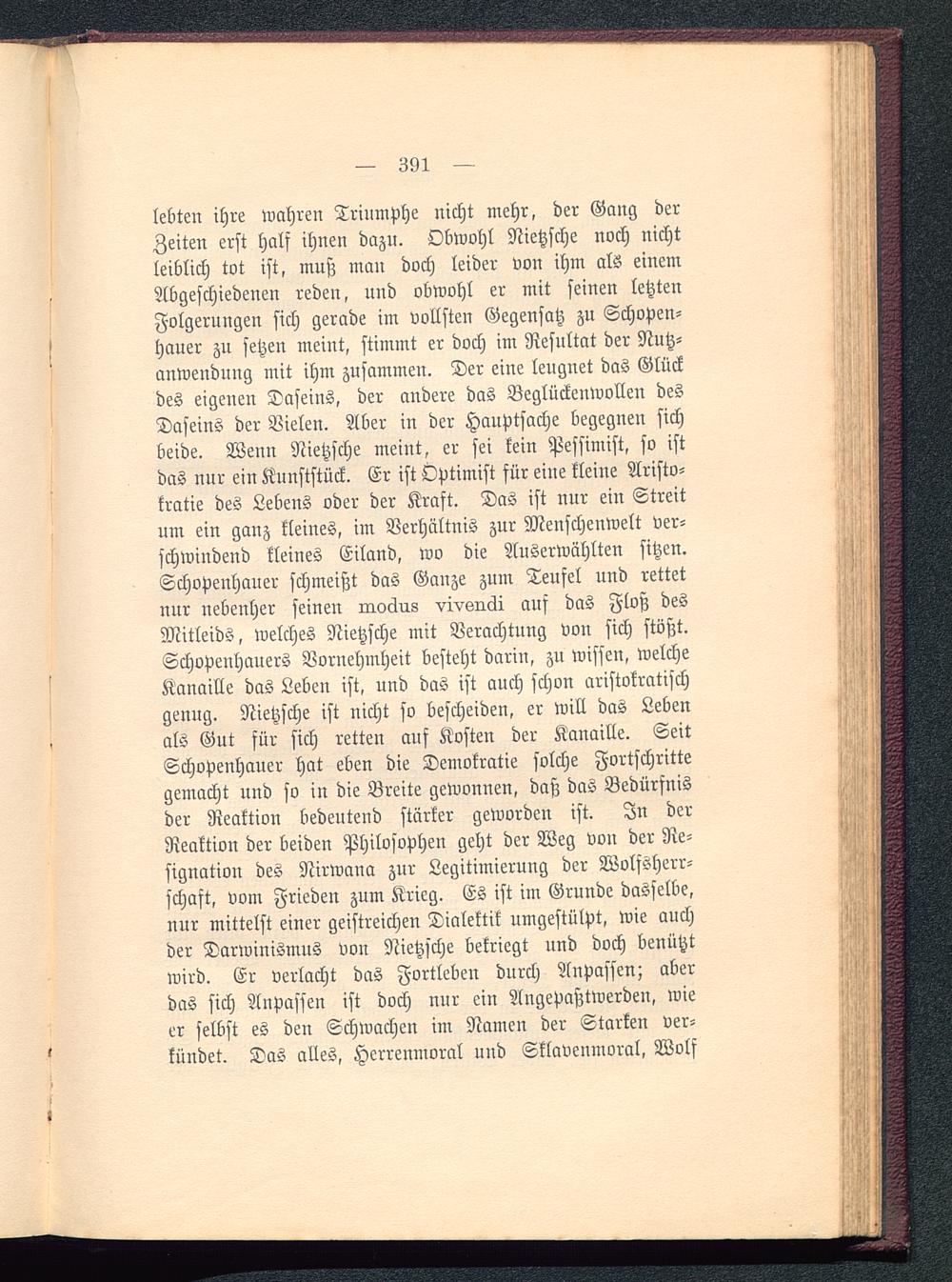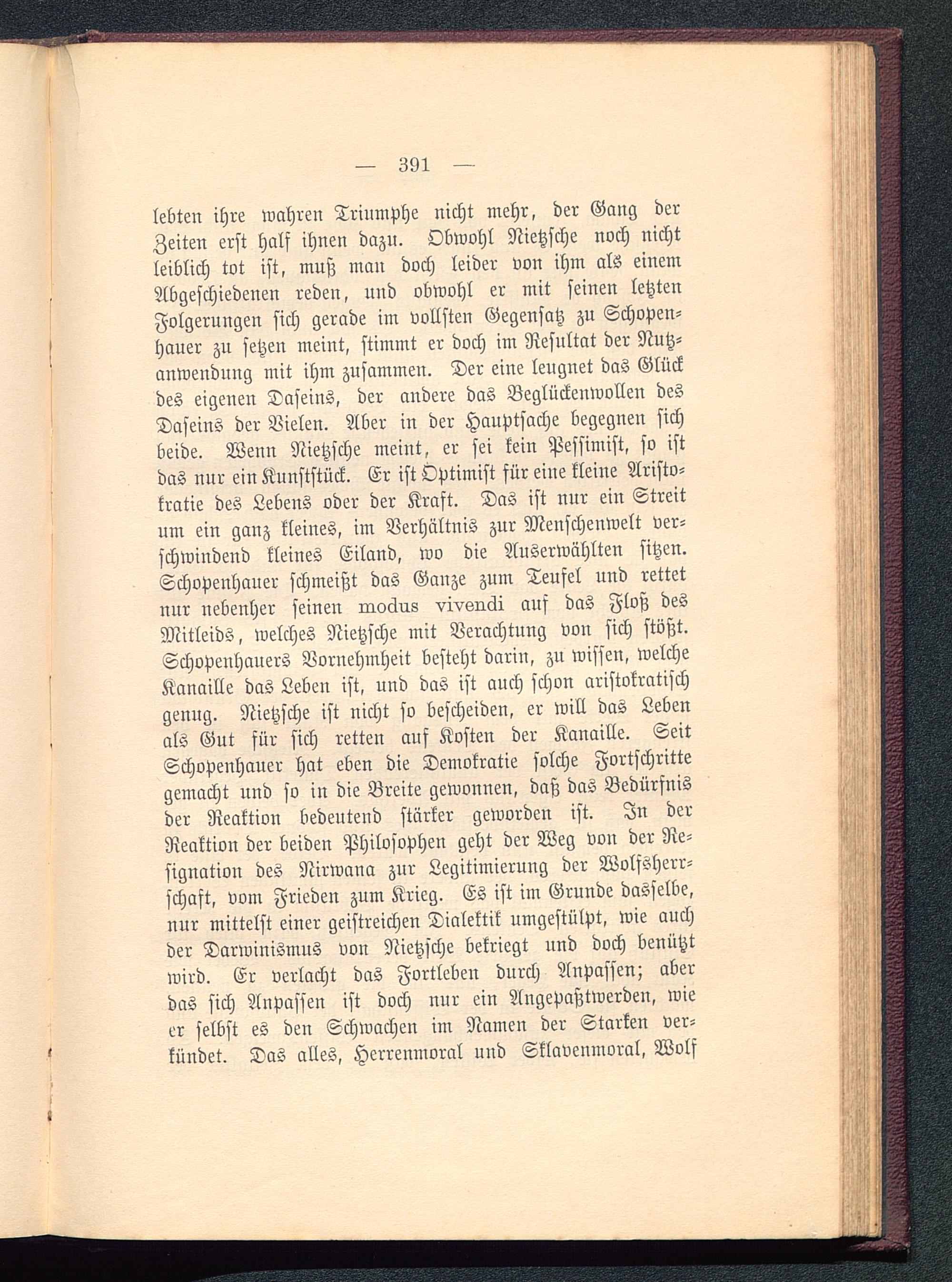 lebten ihre wahren Triumphe nicht mehr, der Gang derZeiten erst half ihnen dazu. Obwohl Nietzsche noch nichtleiblich tot ist, muß man doch leider von ihm als einemAbgeschiedenen reden, und obwohl er mit seinen letztenFolgerungen sich gerade im vollsten Gegensatz zu Schopen-hauer zu setzen meint, stimmt er doch im Resultat der Nutz-anwendung mit ihm zusammen. Der eine leugnet das Glückdes eigenen Daseins, der andere das Beglückenwollen desDaseins der Vielen. Aber in der Hauptsache begegnen sichbeide. Wenn Nietzsche meint, er sei kein Pessimist, so istdas nur ein Kunststück. Er ist Optimist für eine kleine Aristo-kratie des Lebens oder der Kraft. Das ist nur ein Streitum ein ganz kleines, im Verhältnis zur Menschenwelt ver-schwindend kleines Eiland, wo die Auserwählten sitzen.Schopenhauer schmeißt das Ganze zum Teufel und rettetnur nebenher seinen moäus vivsiM auf das Floß desMitleids, welches Nietzsche mit Verachtung von sich stößt.Schopenhauers Vornehmheit besteht darin, zu wissen, welcheKanaille das Leben ist, und das ist auch schon aristokratischgenug. Nietzsche ist nicht so bescheiden, er will das Lebenals Gut für sich retten auf Kosten der Kanaille. SeitSchopenhauer hat eben die Demokratie solche Fortschrittegemacht und so in die Breite gewonnen, daß das Bedürfnisder Reaktion bedeutend stärker geworden ist. In derReaktion der beiden Philosophen geht der Weg von der Re-signation des Nirwana zur Legitimierung der Wolfsherr-schaft, vom Frieden zum Krieg. Es ist im Grunde dasselbe,nur mittelst einer geistreichen Dialektik umgestülpt, wie auchder Darwinismus von Nietzsche bekriegt und doch benütztwird. Er verlacht das Fortleben durch Anpassen; aberdas sich Anpassen ist doch nur ein Angepaßtwerden, wieer selbst es den Schwachen im Namen der Starken ver-kündet. Das alles, Herrenmoral und Sklavenmoral, Wolf