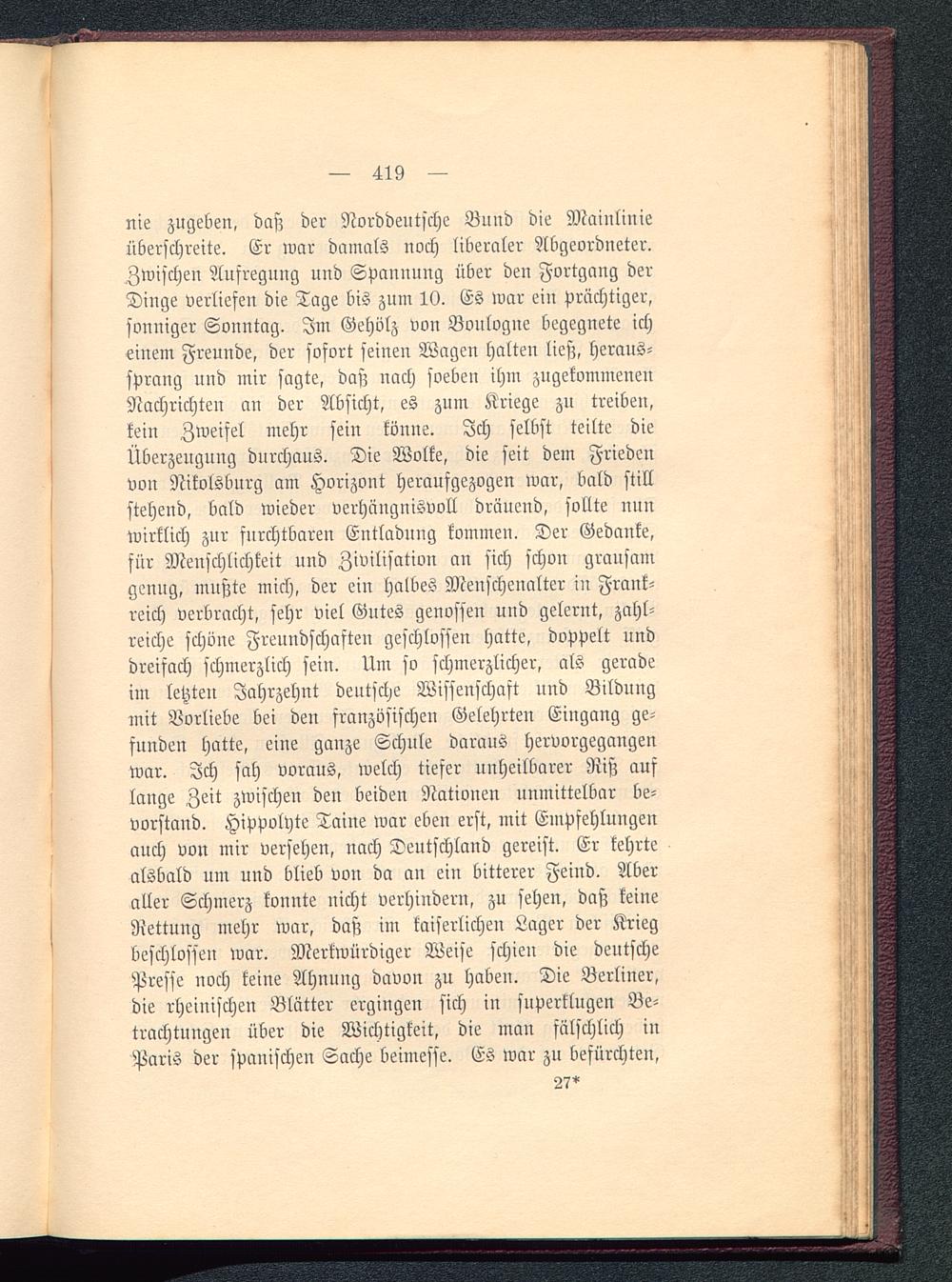 nie zugeben, daß der Norddeutsche Bund die Mainlinieüberschreite. Er war damals noch liberaler Abgeordneter.Zwischen Aufregung und Spannung über den Fortgang derDinge verliefen die Tage bis zum 10. Es war eiu prächtiger,sonniger Sonntag. Im Gehölz von Bonlogne begegnete icheinem Freunde, der sofort seinen Wagen halten ließ, heraus-sprang und mir sagte, daß nach soeben ihm zugekommenenNachrichten an der Absicht, es zum Kriege zu treiben,kein Zweifel mehr sein könne. Ich selbst teilte dieÜberzeugung durchaus. Die Wolke, die seit dem Friedenvon Nikolsburg am Horizont heraufgezogen war, bald stillstehend, bald wieder verhängnisvoll dräuend, sollte nunwirklich zur furchtbaren Entladung kommen. Der Gedanke,für Menschlichkeit und Zivilisation an sich schon grausamgenug, mußte mich, der ein halbes Menscheualter in Frank-reich verbracht, sehr viel Gntes genossen und gelernt, zahl-reiche schöne Freundschaften geschloffen hatte, doppelt unddreifach schmerzlich sein. Um so schmerzlicher, als geradeim letzten Jahrzehnt dentsche Wissenschaft und Bildungmit Vorliebe bei den französischen Gelehrten Eingang ge-funden hatte, eine ganze Schule daraus hervorgegangenwar. Ich sah voraus, welch tiefer unheilbarer Riß auflange Zeit zwischen den beiden Nationen unmittelbar be-vorstand. Hippolyte Taine war eben erst, mit Empfehlungenauch von mir versehen, nach Deutschland gereist. Er kehrtealsbald um und blieb von da an ein bitterer Feind. Aberaller Schmerz konnte nicht verhindern, zu sehen, daß keineRettung mehr war, daß im kaiserlichen Lager der Kriegbeschlossen war. Merkwürdiger Weise schien die deutschePresfe uoch keine Ahnuug davvn zu haben. Die Berliner,die rheinischen Blätter ergingen sich in superklugen Be-trachtungen über die Wichtigkeit, die man fälschlich inParis der spanischen Sache beimesse. Es war zu befürchten,