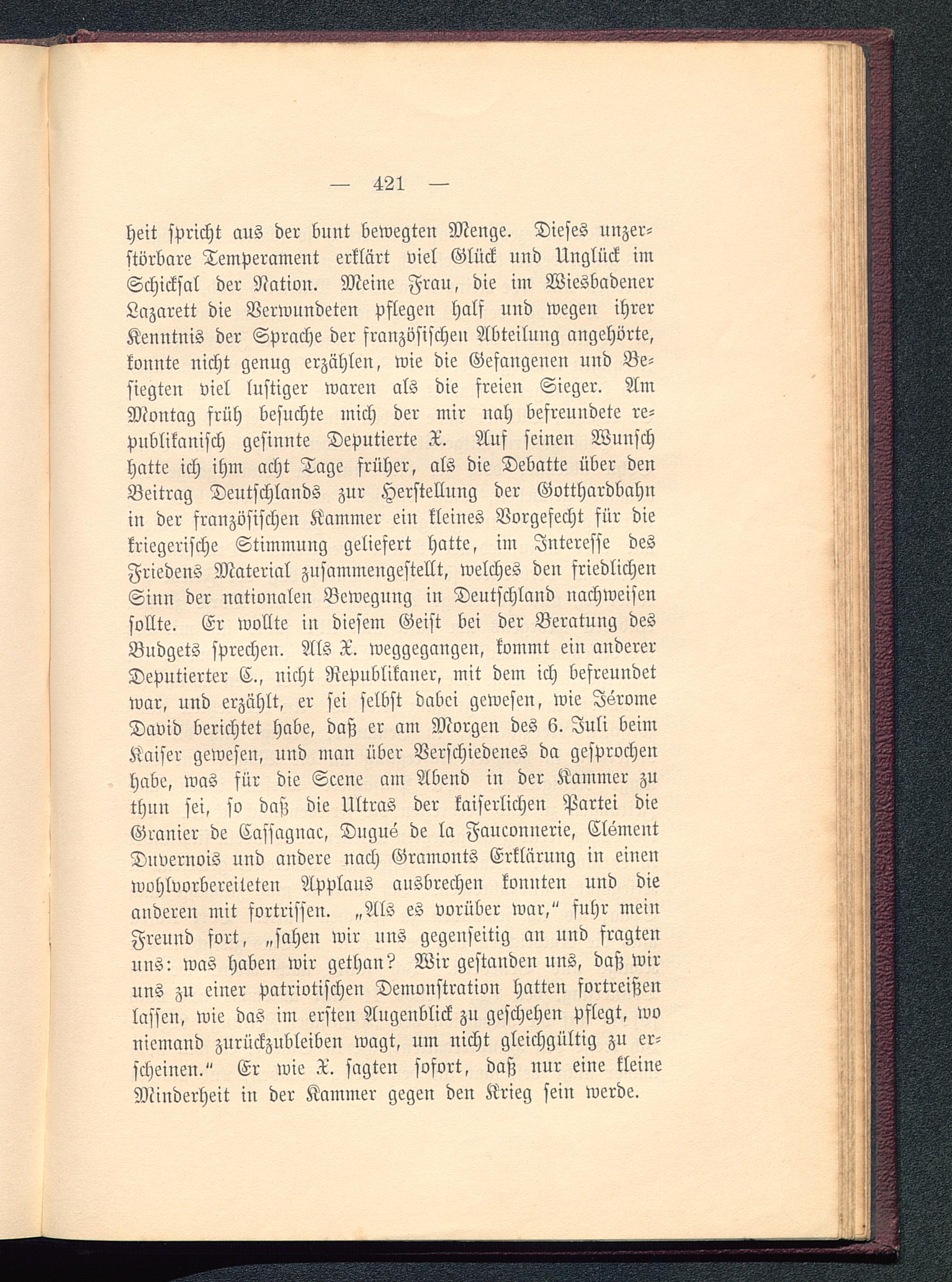 heit spricht aus der bunt bewegten Menge. Dieses unzer-störbare Temperament erklärt viel Glück und Unglück imSchicksal der Nation. Meine Frau, die im Wiesbadener Lazarett die Verwundeten Pflegen half und wegen ihrerKenntnis der Sprache der französischen Abteilung angehörte,konnte nicht genug erzählen, wie die Gefangenen und Be-siegten viel lustiger waren als die freien Sieger. AmMontag früh besuchte mich der mir nah befreundete re-publikanisch gesinnte Deputierte Auf seinen Wunschhatte ich ihm acht Tage früher, als die Debatte über denBeitrag Deutschlands zur Herstellung der Gotthardbahn in der französischen Kammer ein kleines Vorgefecht für diekriegerische Stimmung geliefert hatte, im Interesse desFriedens Material zusammengestellt, welches den friedlichenSinn der nationalen Bewegung in Deutschland nachweisensollte. Er wollte in diesem Geist bei der Beratung desBudgets sprechen. Als T. weggegangen, kommt ein andererDeputierter C., nicht Republikaner , mit dem ich befreundetwar, und erzählt, er sei selbst dabei gewesen, wie JsromeDavid berichtet habe, daß er am Morgen des 6. Juli beimKaiser gewesen, und man über Verschiedenes da gesprochenhabe, was für die Scene am Abend in der Kammer zuthuu sei, so daß die Ultras der kaiserlichen Partei dieGramer de Cassagnac, Dugus de la Fauconnerie, ElementDuvernois und andere nach Gramonts Erklärung in einenwvhlvorbereiteten Applaus ausbrechen konnten nnd dieanderen mit fortrisfen. „Als es vorüber war," fuhr meinFreund fort, „sahen wir uns gegenseitig an und fragtenuns: was haben wir gethan? Wir gestanden uns, daß wiruns zu einer patriotischen Demonstration hatten fortreißenlassen, wie das im ersten Augenblick zu geschehen Pflegt, woniemand zurückzubleiben wagt, um nicht gleichgültig zu er-scheinen." Er wie .5. sagten sofort, daß nur eine kleineMinderheit in der Kammer gegen den Krieg sein werde.