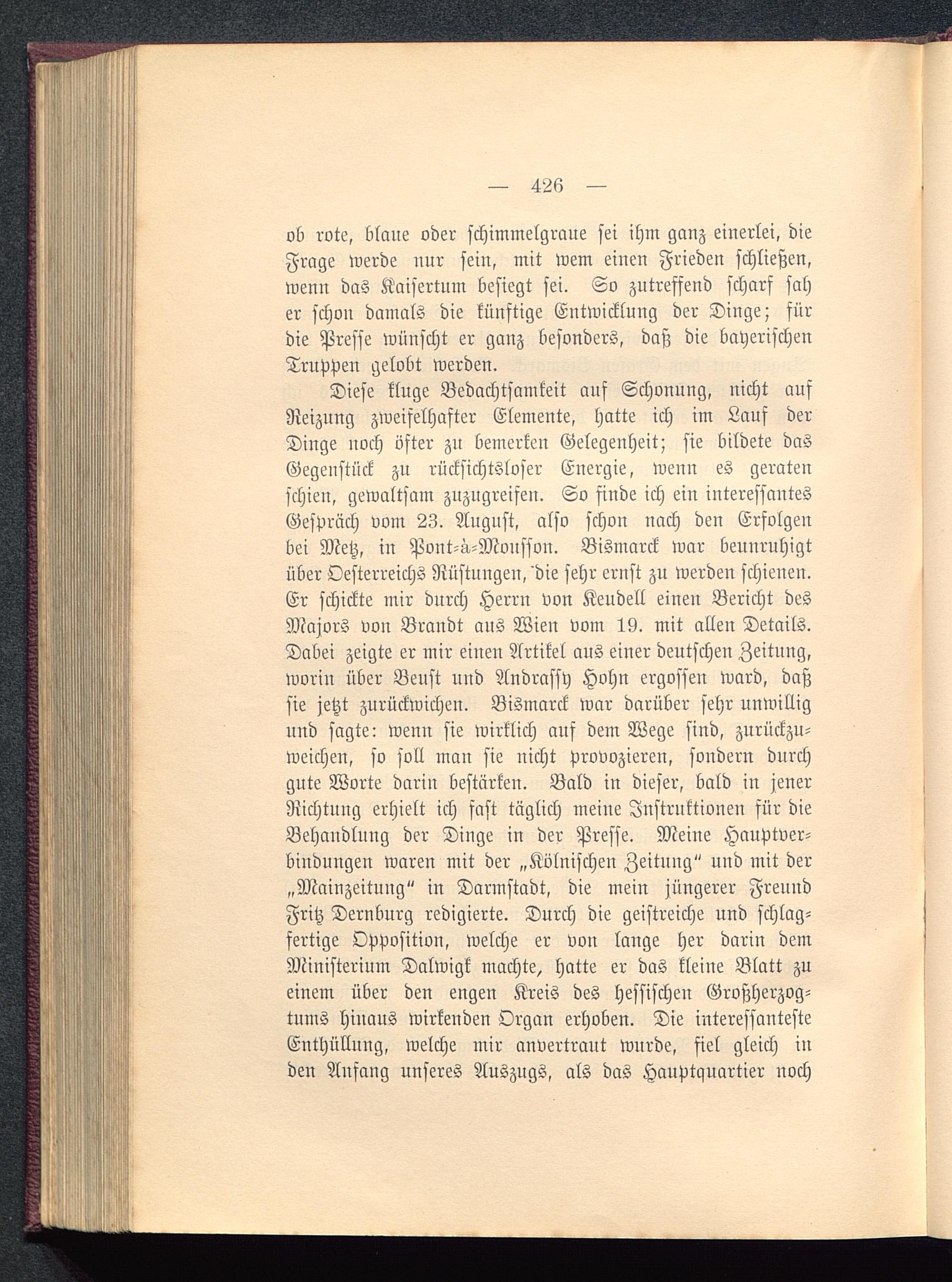 Diese kluge Bedachtsamkeit auf Schonung, nicht aufReizung zweifelhafter Elemente, hatte ich im Lauf derDinge uoch öfter zu bemerken Gelegenheit; sie bildete dasGegenstück zu rücksichtsloser Energie, wenn es geratenschien, gewaltsam zuzugreifen. So finde ich ein interessantesGespräch vom 23. August, also schon nach den Erfolgenbei Metz, iu Pont-s.-Monsson. Bismarck war beunruhigtüber Oesterreichs Rüstuugeu, die sehr ernst zu werden schienen.Er schickte mir durch Herrn von Keudell einen Bericht desMajors von Brandt aus Wieu vom 19. mit allen Details.Dabei zeigte er mir einen Artikel aus einer deutscheu Zeitung,worin über Beust und Andrassy Hohn ergossen ward, daßsie jetzt zurückwichen. Bismarck war darüber sehr unwilligund sagte: wenn sie wirklich auf dem Wege sind, zurückzu-weichen, so soll man sie nicht provozieren, sondern durchgute Worte darin bestärken. Bald in dieser, bald in jenerRichtung erhielt ich sast täglich meine Instruktionen für dieBehandlung der Dinge in der Presse. Meine Hauptver-bindungen waren mit der „Kölnischen Zeitung " und mit der„Mainzeitung" in Darmstadt , die mein jüngerer FreundFritz Dernbnrg redigierte. Durch die geistreiche und schlag-fertige Opposition, welche er von lange her darin demMinisterium Dalwigk machte, hatte er das kleine Blatt zueinem über den engen Kreis des hessischen Großherzog-tums hinaus wirkenden Organ erhoben. Die interessantesteEnthüllung, welche mir anvertraut wurde, siel gleich inden Anfang unseres Auszugs, als das Hauptquartier noch
