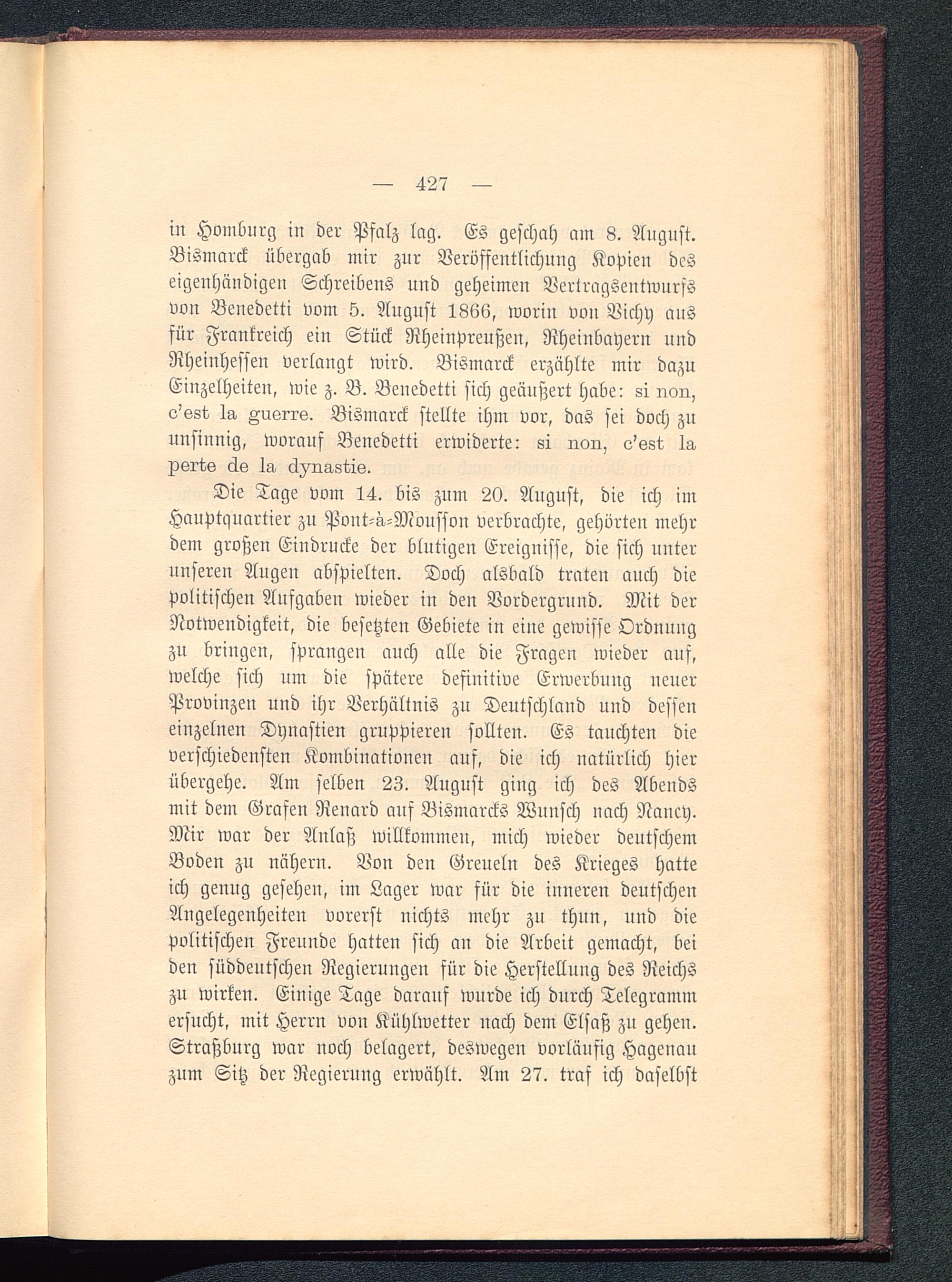 Die Tage vom 14. bis zum 20. August, die ich imHauptquartier zu Pont-g-Monsson verbrachte, gehörten mehrdem großen Eindrucke der blutigen Ereignisse, die sich uuterunseren Augen abspielten. Doch alsbald traten auch diePolitischen Aufgaben wieder in den Vordergrund. Mit derNotwendigkeit, die besetzten Gebiete in eine gewisse Ordnungzu bringen, sprangen auch alle die Fragen wieder auf,welche sich um die spätere definitive Erwerbung neuerProvinzen und ihr Verhältnis zu Deutschland und desseneinzelnen Dynastien gruppieren sollten. Es tauchten dieverschiedensten Kombinationen auf, die ich natürlich hierübergehe. Am selben 23. August ging ich des Abendsmit dem Grafen Reuard auf Bismarcks Wunsch nach Naney.Mir war der Anlaß willkommen, mich wieder deutschemBoden zu nähern. Von den Greueln des Krieges hatteich genug gesehen, im Lager war für die inneren deutschenAngelegenheiten vorerst uichts mehr zu thun, und diepolitischen Freuude hatteu sich an die Arbeit gemacht, beiden süddeutschen Regierungen für die Herstellung des Reichszu wirken. Einige Tage darauf wurde ich durch Telegrammersucht, mit Herrn von Kühlwetter nach dem Elsaß zn gehen.Straßburg war noch belagert, deswegen vorläufig Hagenauzum Sitz der Regierung erwählt. Am 27. traf ich daselbst