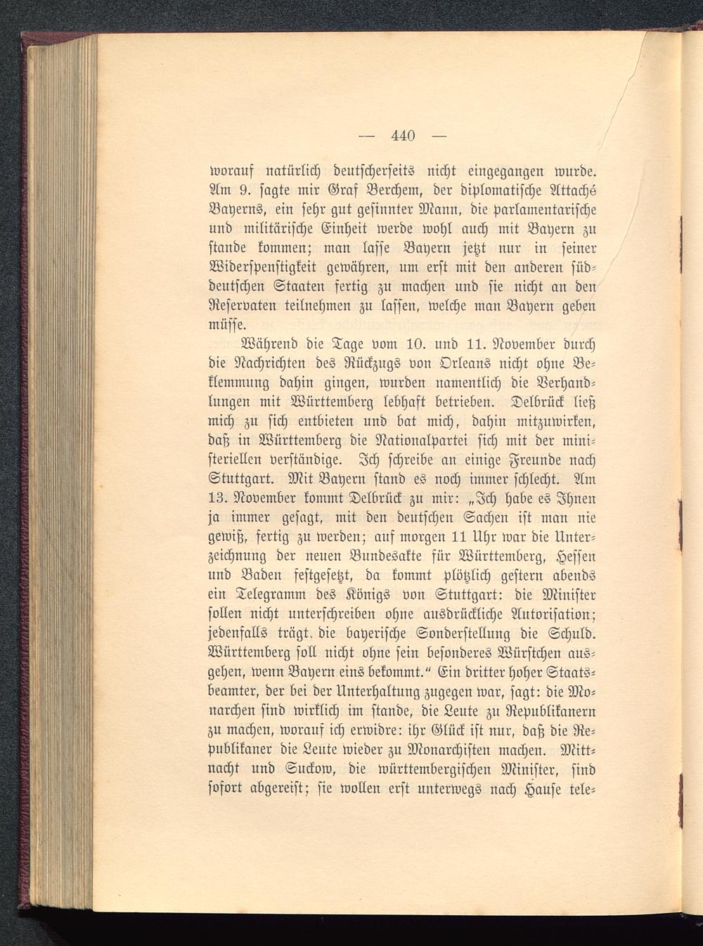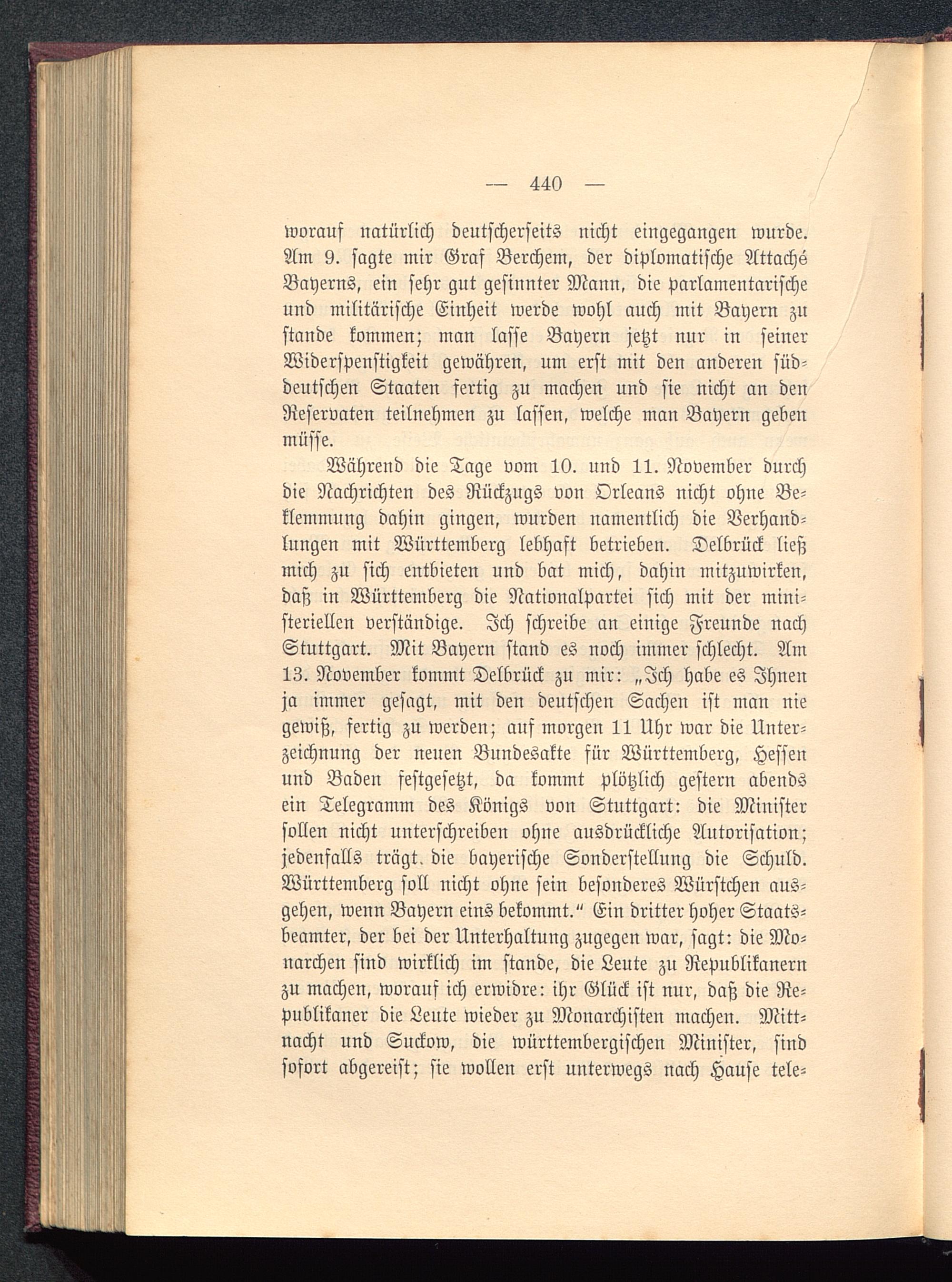 Während die Tage vom 10. und 11. November durchdie Nachrichten des Rückzugs von Orleans nicht ohne Be-klemmung dahin gingen, wurden namentlich die Verhand-lungen mit Württemberg lebhaft betrieben. Delbrück ließmich zu sich entbieten und bat mich, dahin mitzuwirken,daß in Württemberg die Nationalpartei sich mit der mini-steriellen verständige. Ich schreibe an einige Freunde nachStuttgart. Mit Bayern stand es noch immer schlecht. Am13. November kommt Delbrück zu mir: „Ich habe es Ihnenja immer gesagt, mit den deutschen Sachen ist man niegewiß, fertig zu werden; auf morgen 11 Uhr war die Unter-zeichnung der neuen Bundesakte für Württemberg, Hessen und Baden festgesetzt, da kommt Plötzlich gestern abendsein Telegramm des Königs von Stuttgart : die Ministersollen nicht unterschreiben ohne ausdrückliche Autorisation;jedenfalls trägt, die bayerische Sonderstellung die Schuld.Württemberg soll uicht ohne sein besonderes Würstchen aus-gehen, wenn Bayern eins bekommt." Ein dritter hoher Staats-beamter, der bei der Unterhaltung zugegen war, sagt: die Mo-narchen sind wirklich im stände, die Leute zu Republikanernzu machen, worauf ich erwidre: ihr Glück ist nur, daß die Re-publikaner die Leute wieder zu Monarchisten machen. Mitt-nacht und Suckow, die württembergischen Minister, sindsofort abgereist; sie wollen erst unterwegs nach Hause tele-