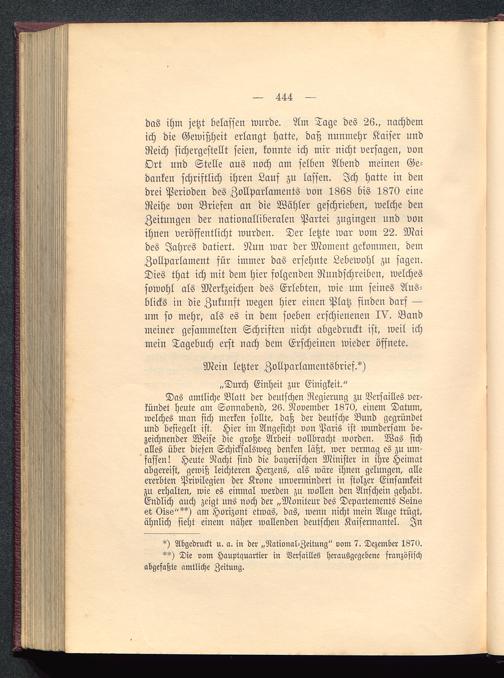 das ihm jetzt belassen wurde. Am Tage des 26., nachdemich die Gewißheit erlangt hatte, daß nunmehr Kaiser undReich sichergestellt seien, konnte ich mir nicht versagen, vonOrt und Stelle aus noch am selben Abend meinen Ge-danken schriftlich ihren Lauf zu lassen. Ich hatte in dendrei Perioden des Zollparlaments von 1868 bis 1870 eineReihe von Briefen an die Wühler geschrieben, welche denZeitungen der nationalliberalen Partei zngingen und vonihnen veröffentlicht wurden. Der letzte war vom 22. Maides Jahres datiert. Nun war der Moment gekommen, demZollparlament für immer das ersehnte Lebewohl zu sagen.Dies that ich mit dem hier folgenden Rundschreiben, welchessowohl als Merkzeichen des Erlebten, wie um seines Aus-blicks in die Zukunft wegen hier einen Platz finden darf —um fo mehr, als es in dem soeben erschienenen IV. Bandmeiner gesammelten Schriften nicht abgedruckt ist, weil ichmein Tagebuch erst nach dem Erscheinen wieder öffnete.