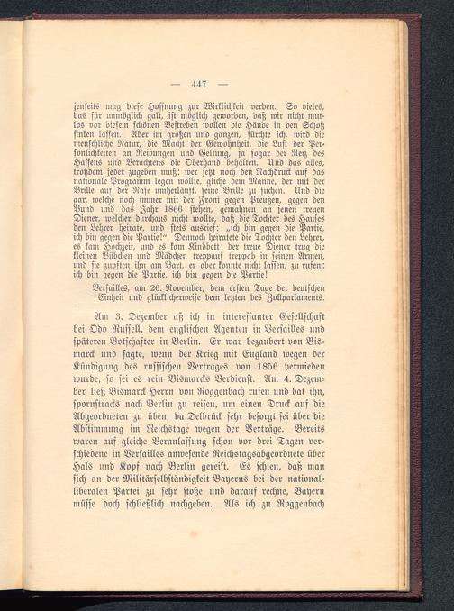 Am 3. Dezember aß ich in interessanter Gesellschaftbei Odo Russell, dem englischen Agenten in Versailles undspäteren Botschafter in Berlin . Er war bezaubert von Bis-marck und sagte, wenn der Krieg mit England wegen derKündigung des russischen Vertrages von 1856 vermiedenwurde, so sei es rein Bismarcks Verdienst. Am 4. Dezem-ber ließ Bismarck Herrn von Roggenbach rufen und bat ihn,spornstracks nach Berlin zu reisen, um einen Druck auf dieAbgeordneten zu üben, da Delbrück sehr besorgt sei über dieAbstimmung im Reichstage wegen der Verträge. Bereitswaren auf gleiche Veranlassung schon vor drei Tagen ver-schiedene in Versailles anwesende Reichstagsabgeordnete überHals und Kopf nach Berlin gereist. Es schien, daß mansich an der Militärselbständigkeit Bayerns bei der national-liberalen Partei zn sehr stoße und darauf rechne, Bayern müsse doch schließlich nachgeben. Als ich zu Roggenbach