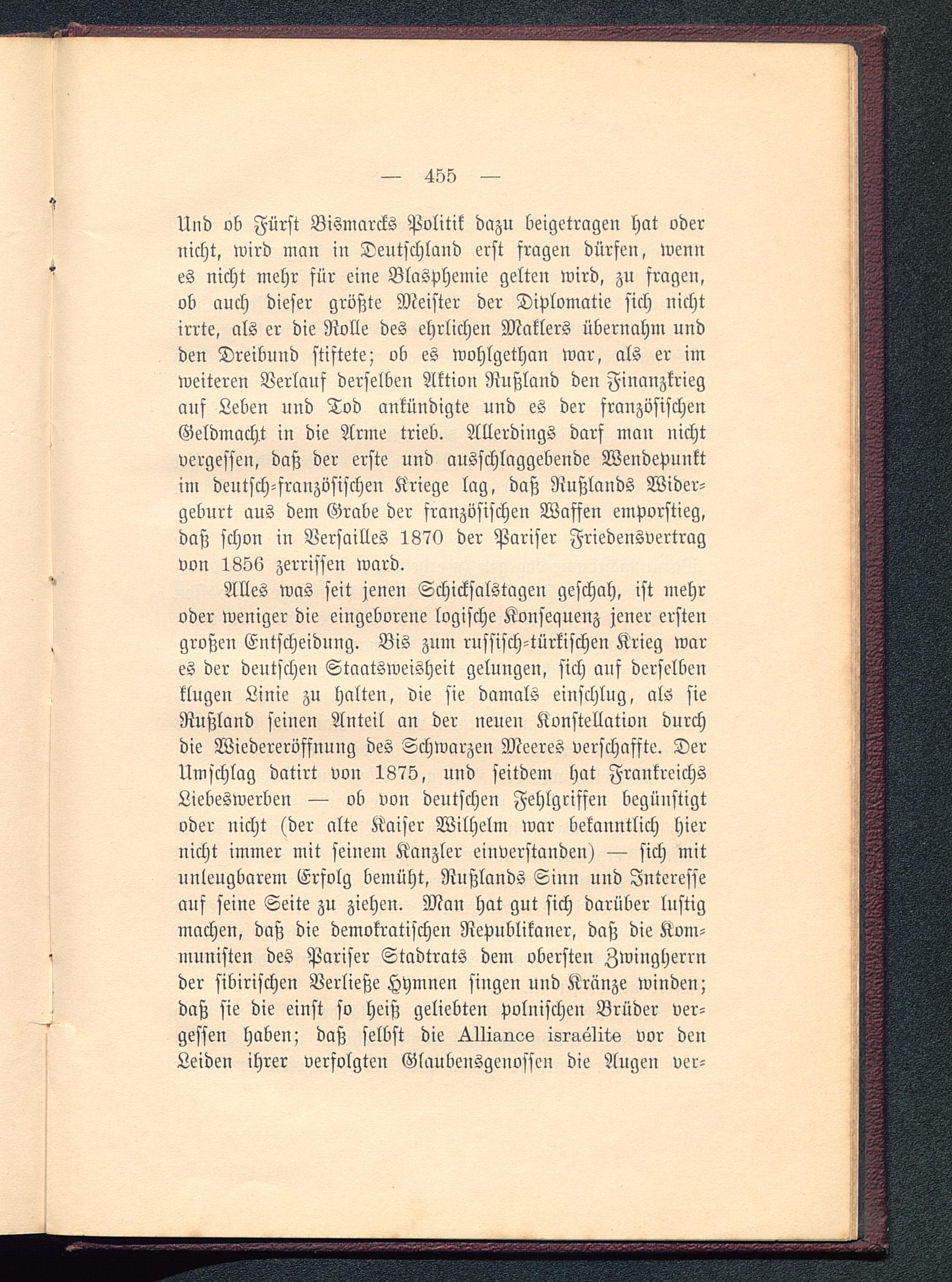 Und ob Fürst Bismarcks Politik dazu beigetragen hat odernicht, wird man in Deutschland erst fragen dürfen, wennes nicht mehr für eine Blasphemie gelten wird, zu fragen,ob auch dieser größte Meister der Diplomatie sich nichtirrte, als er die Rolle des ehrlichen Maklers übernahm undden Dreibund stiftete; ob es wohlgethan war, als er imweiteren Verlauf derselben Aktion Rußland den Finanzkriegauf Leben und Tod ankündigte und es der französischenGeldmacht in die Arme trieb. Allerdings darf man nichtvergessen, daß der erste und ausschlaggebende Wendepunktini deutsch -französischen Kriege lag, daß Nußlands Wider-gebnrt aus dem Grabe der französischen Waffen emporstieg,daß schon in Versailles 1870 der Pariser Friedensvertragvon 1856 zerrissen ward.