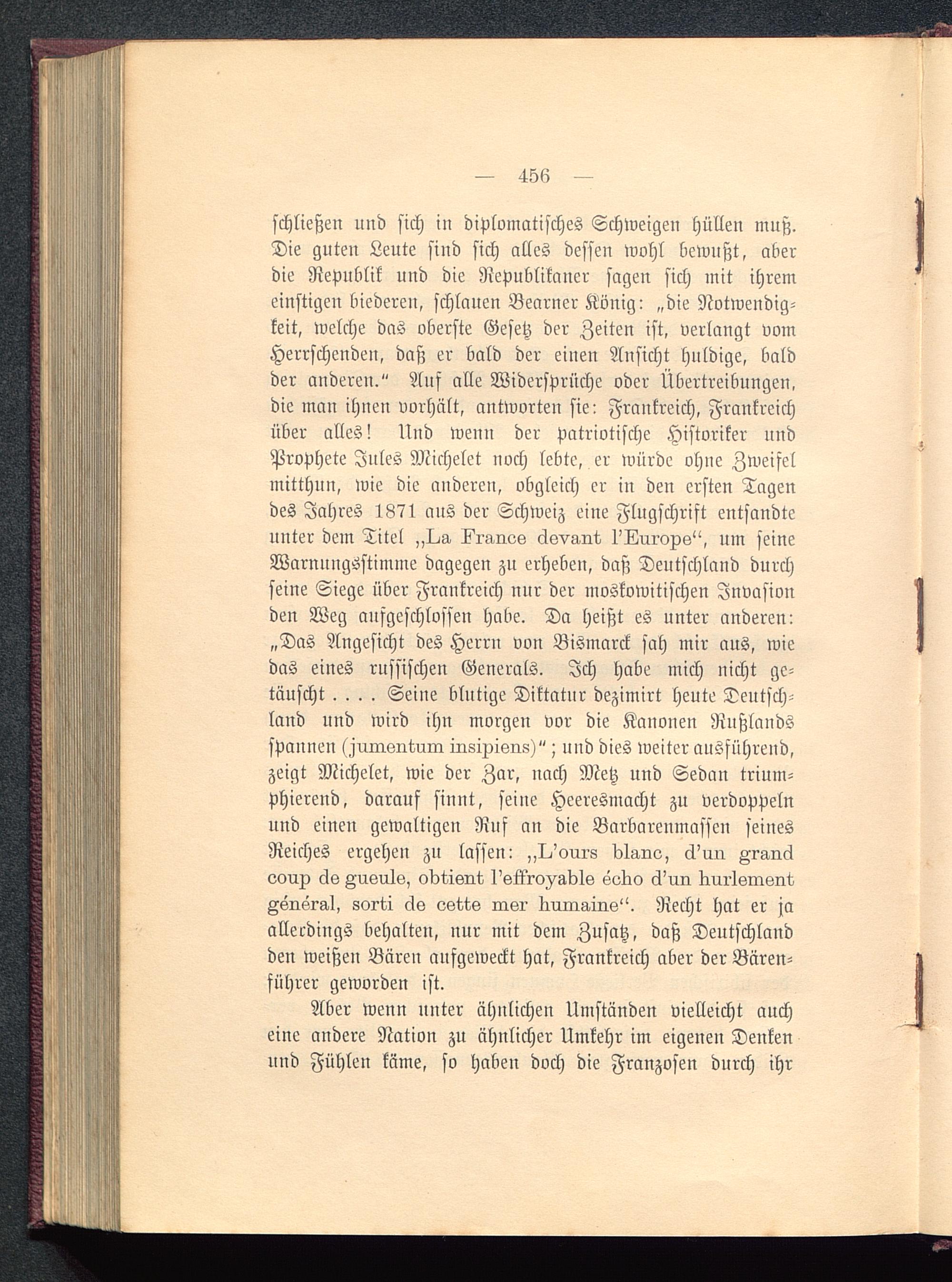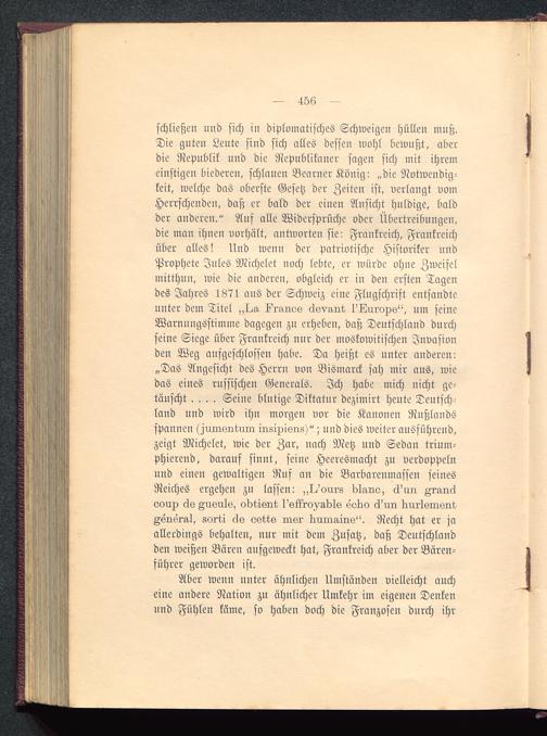 schließen und sich in diplomatisches Schweigen hüllen muß.Die guten Leute sind sich alles dessen wohl bewußt, aberdie Republik und die Republikaner sagen sich mit ihremeinstigen biederen, schlauen Bearner König: „die Notwendig-keit, welche das oberste Gesetz der Zeiten ist, verlangt vomHerrschenden, daß er bald der einen Ansicht huldige, baldder anderen." Ans alle Widersprüche oder Übertreibungen,die man ihnen vorhält, antworten sie: Frankreich, Frankreich über alles! lind wenn der patriotische Historiker undProphete Jules Michelet noch lebte, er würde ohne Zweifelmitthun, wie die anderen, obgleich er in den ersten Tagendes Jahres 187l ans der Schweiz eine Flugschrift entsandteunter dem Titel „I^a, ?ranv6 clsvant, um seine