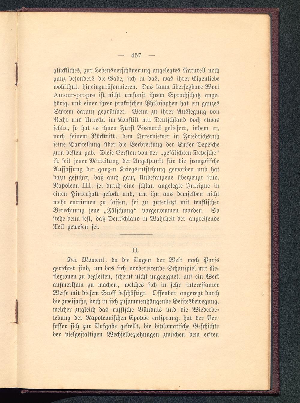 glückliches, zur Lebensverschönerung angelegtes Naturell nochganz besonders die Gabe, sich in das, was ihrer Eigenliebewohlthut, hineinzuräsonnieren. Das kaum übersetzbare Wort^.morir-xroxi-s ist nicht umsonst ihrem Sprachschatz ange-hörig, und einer ihrer praktischen Philosophen hat ein ganzesSystem darauf gegründet. Wenn zu ihrer Auslegung vonRecht und Unrecht im Konflikt mit Deutschland doch etwasfehlte, so hat es ihnen Fürst Bismarck geliefert, indem er,nach seinem Rücktritt, dem Interviewer in Friedrichsruh seine Darstellung über die Verbreitung der Emser Depeschezum besten gab. Diese Version von der „gefälschten Depesche"ist seit jener Mitteilung der Angelpunkt für die französischeAuffassung der ganzen Kriegsentstehung geworden und hatdazu geführt, daß auch ganz Unbefangene überzeugt sind,Napoleon III. sei durch eine schlau angelegte Intrigue ineinen Hinterhalt gelockt und, um ihn aus demselben nichtmehr entrinnen zu lassen, sei zu guterletzt mit teuflischerBerechnung jene „Fälschung" vorgenommen worden. Sostehe denn fest, daß Deutschland in Wahrheit der angreifendeTeil gewesen sei.