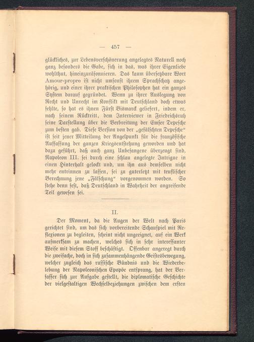 Der Moment, da die Augen der Welt nach Paris gerichtet sind, um das sich vorbereitende Schauspiel mit Re-flexionen zu begleiten, scheint nicht ungeeignet, auf ein Werkaufmerksam zu machen, welches sich in sehr interessanterWeise mit diesem Stoff beschäftigt. Offenbar angeregt durchdie zweifache, doch in sich zusammenhängende Geistesbewegung,welcher zugleich das russische Bündnis und die Wiederbe-lebung der Napolevnischen Epopöe entsprang, hat der Ver-fasser sich zur Aufgabe gestellt, die diplomatische Geschichteder vielgestaltigen Wechselbeziehungen zwischen dem ersten